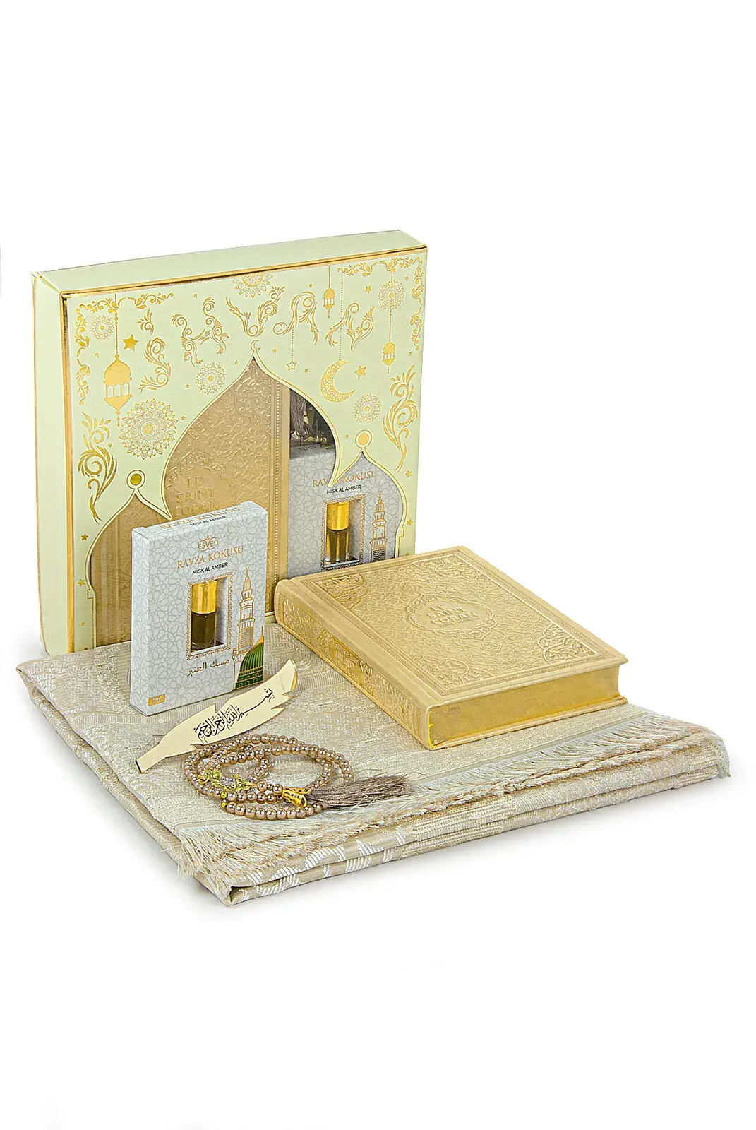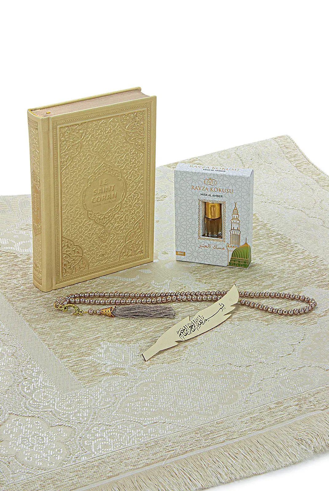 Fransızca Mealli Medine Hatlı Kuranı Kerim ve Seccade Seti Krem
