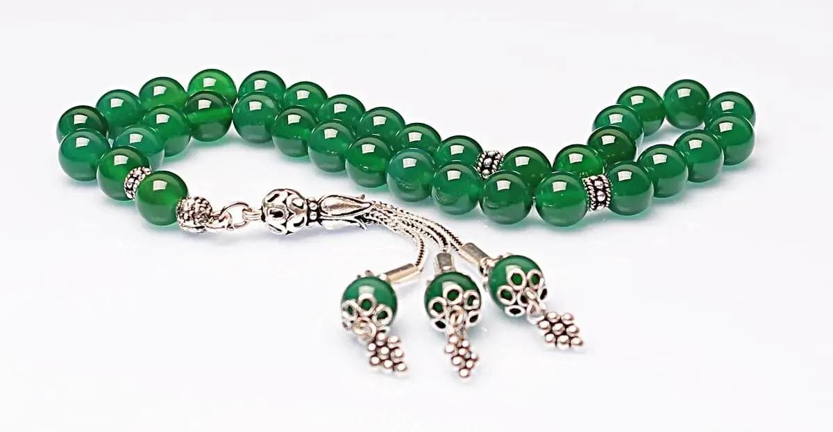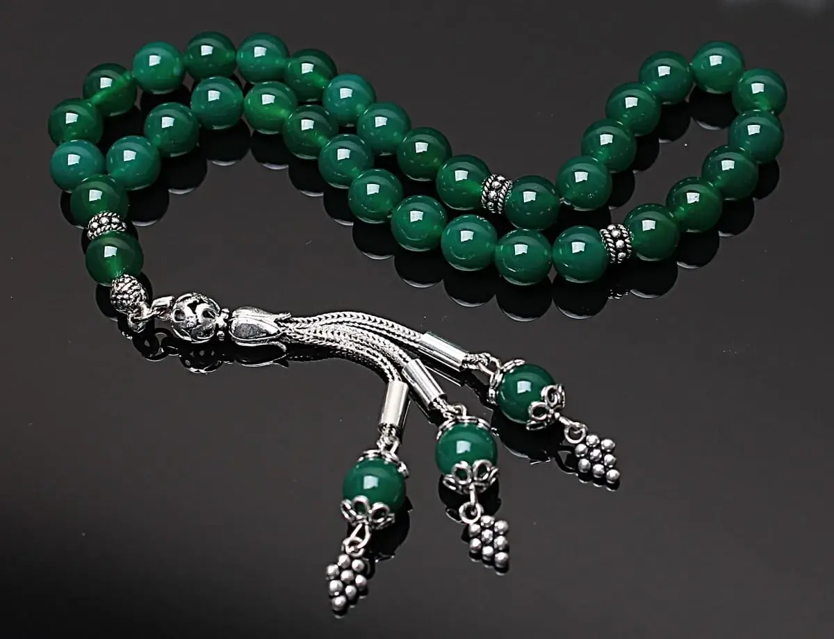 Gelince Haber Ver%100 orijinal ve en iyi kalite yeşil akik taşı ile 925 ayar gümüş malzemelerden üretilmiş 33'lük doğal taş tesbihtir. Tesbihte ip kesmelerine en dayanıklı malzeme olan misina lastiği kullanılmıştır. Yeşil akik taşı tesbihin taneleri küre kesim, çapları ise yaklaşık olarak 8mm'dir.