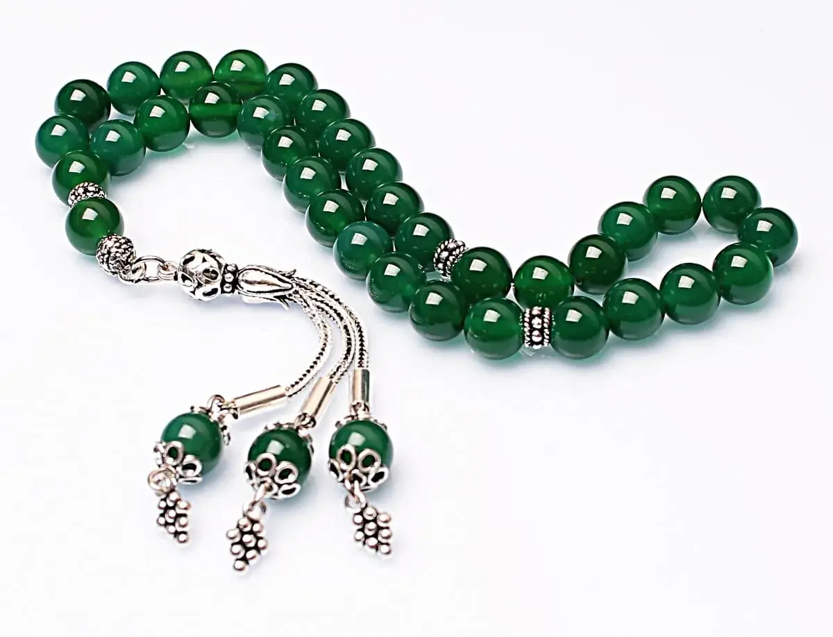 NOT: Bu tesbih yeşil akik taşının en güzel tonlarından ve en iyi kalitesinden özenle seçilerek, birinci kalite saf 925 AYAR GÜMÜŞ malzemeler ile birlikte üretilmiştir. Yeşil akik taşı tesbihin taneleri küre kesim, çapları ise yaklaşık olarak 8mm'dir.