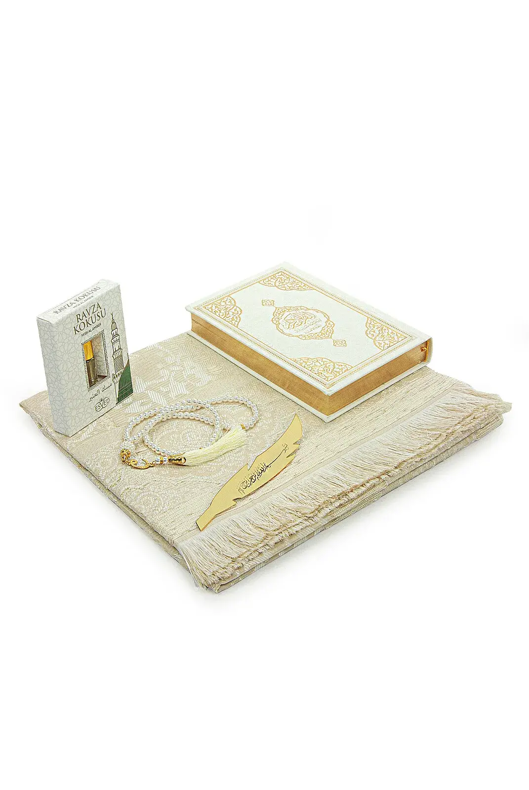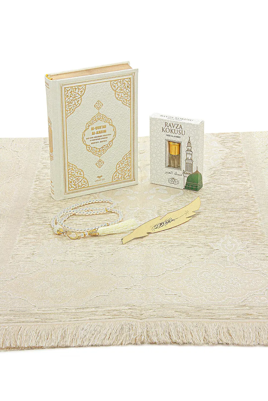 German Meaning Medina Calligraphy Quran and Prayer Rug Set White