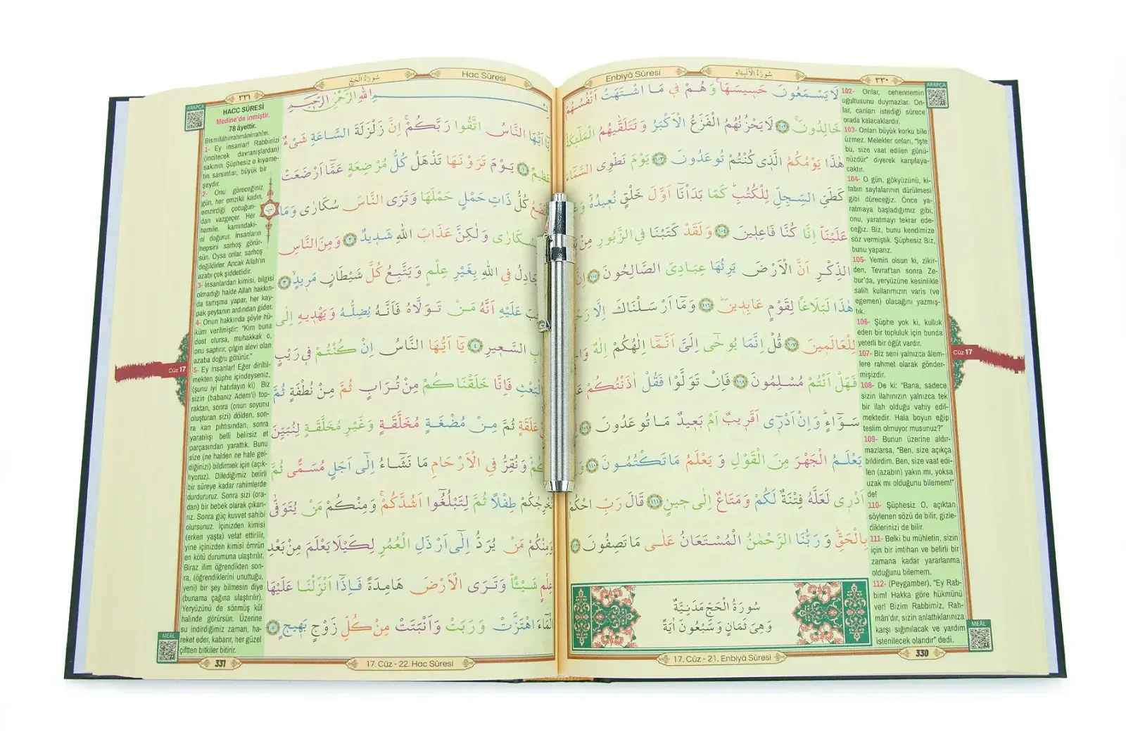 Gizli Yazılar: Sayfalarda yer alan satır altı Türkçe okunuşları ve mealleri, sadece özel ışık kalemiyle görünür hale gelir.