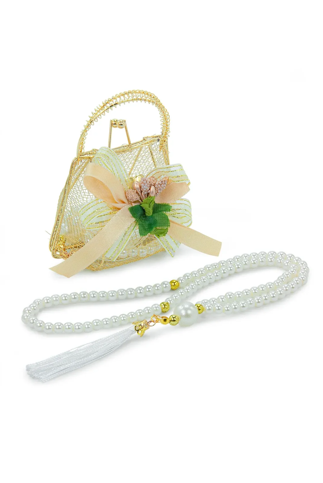 Zarif detayları ve şık sunumuyla öne çıkan Gold Mini Çantalı İnci Tesbihli Mevlüt Hediye Seti – Beyaz, özel günlerde anlamlı ve estetik bir hediye alternatifi sunar. İnci görünümlü beyaz tesbih, gold renk metal çerçeveli mini çanta içerisinde özenle hazırlanmıştır.