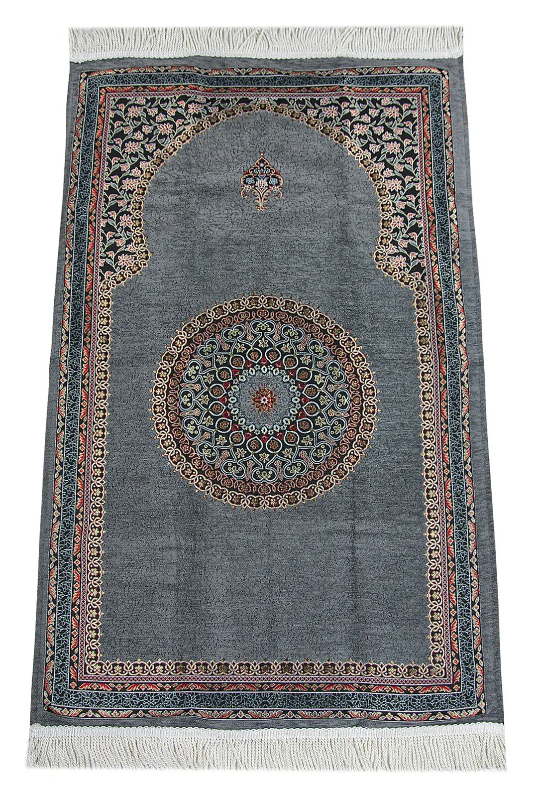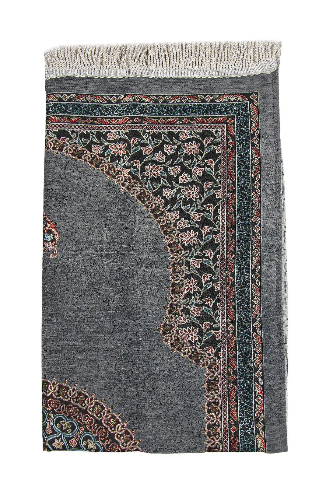 Gray Traditional Motif Knitted Fringed Mihrab Lined Chenille Prayer Rug