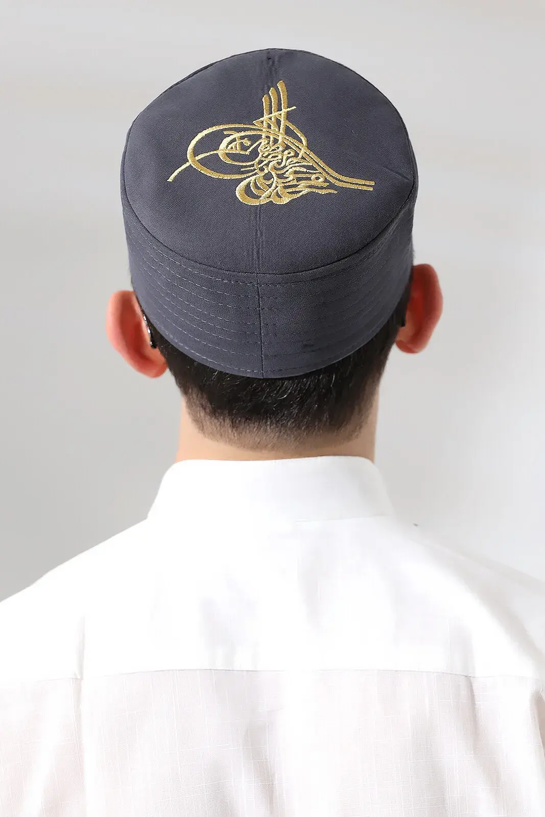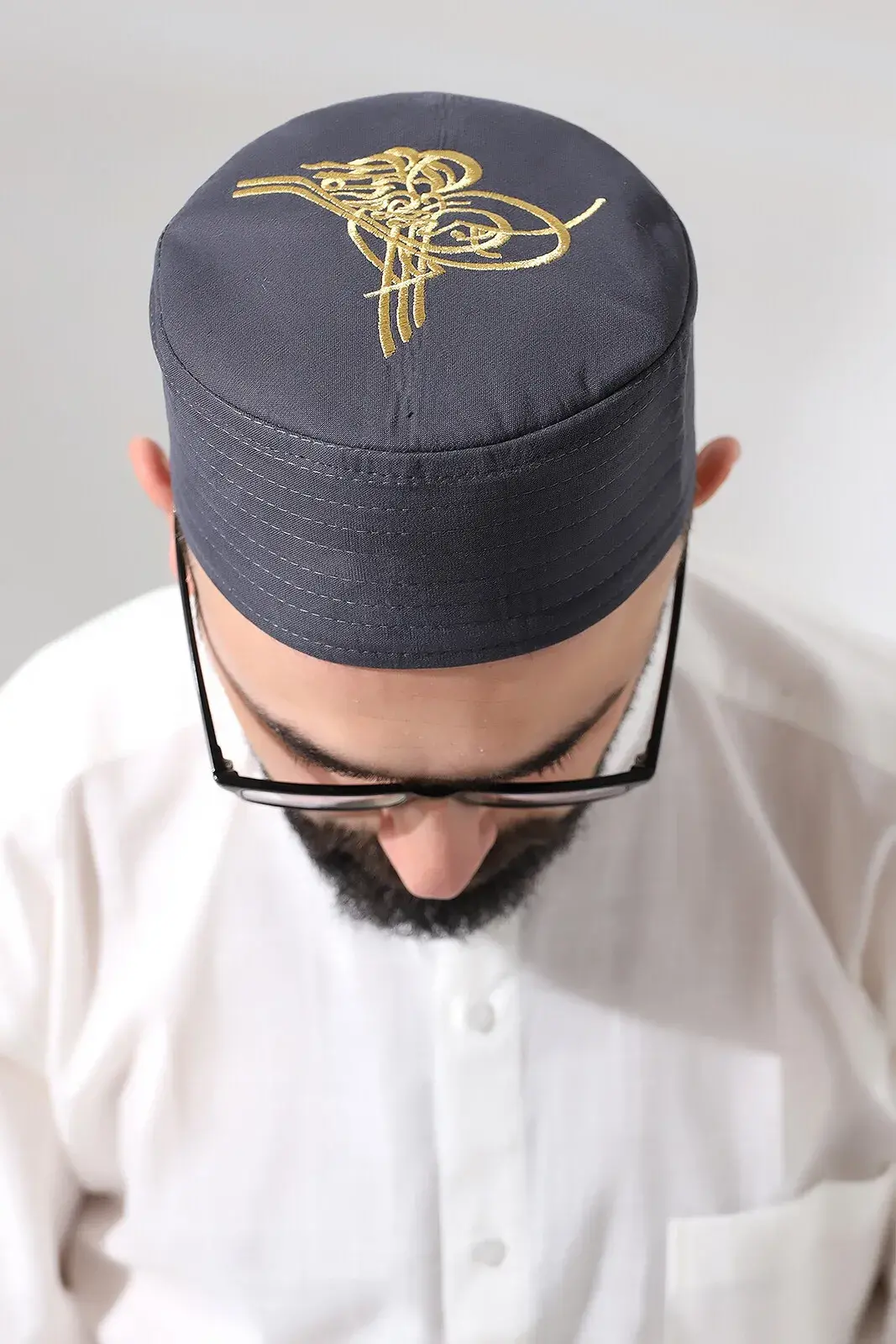 Gri Kapitone Osmanlı Tuğrası Nakışlı Kalıp Namaz Takkesi