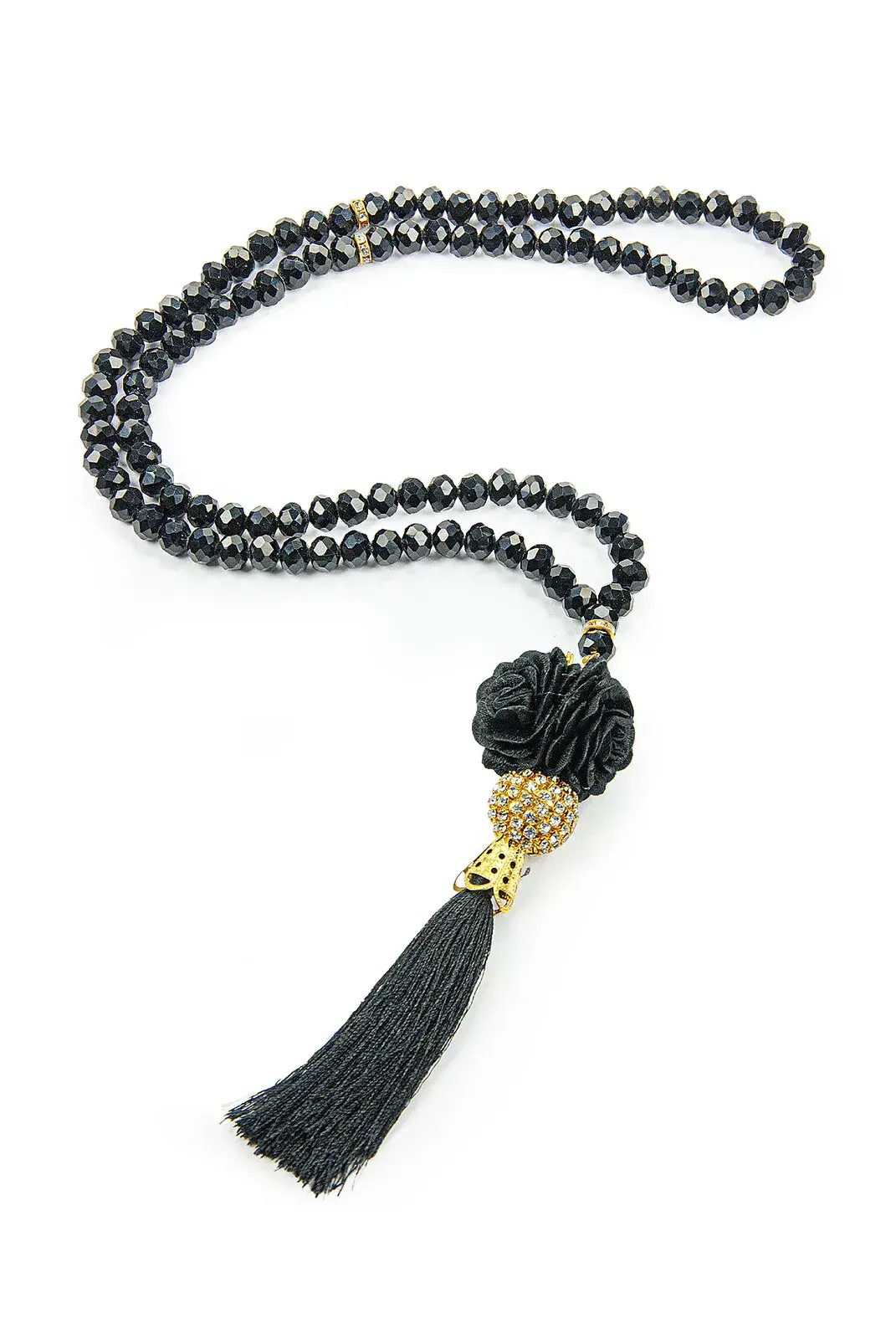 Gül Püskülü Detaylı Kristal Görünümlü 99lu Hac Umre Hediyelik Tesbih Siyah