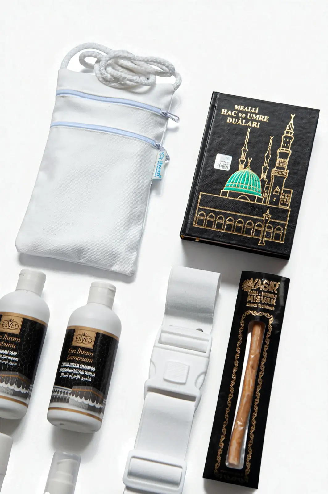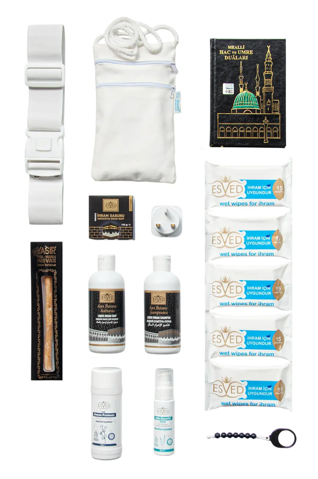 Hac ve Umre ibadetleriniz için hazırlanmış 12 Parça İhrama Uygun Kokusuz Hijyen ve İhtiyaç Seti, parfümsüz bakım ürünleri ve temel ekipmanları tek pakette sunar. İhram kemeri, dönüştürücü priz, para kesesi ve dua kitabı gibi zorunlu ihtiyaçları da içerir.