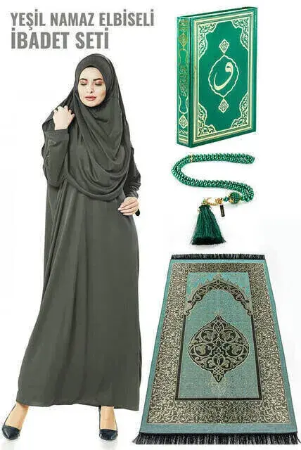Gelince Haber VerHaki Yeşil Namaz Elbisesi, Kuranı Kerim, 99 lu Vavlı İnci Tesbih ve Ekonomik Osmanlı Tafta Seccadeden Oluşan Set
