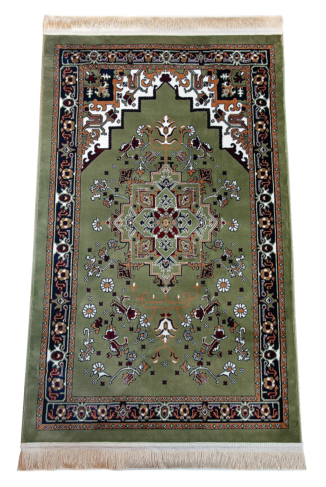 Geleneksel halı motiflerinden ilham alınarak tasarlanan bu seccade, yeşil tonların zarif uyumuyla bulunduğu ortama estetik bir görünüm kazandırır.