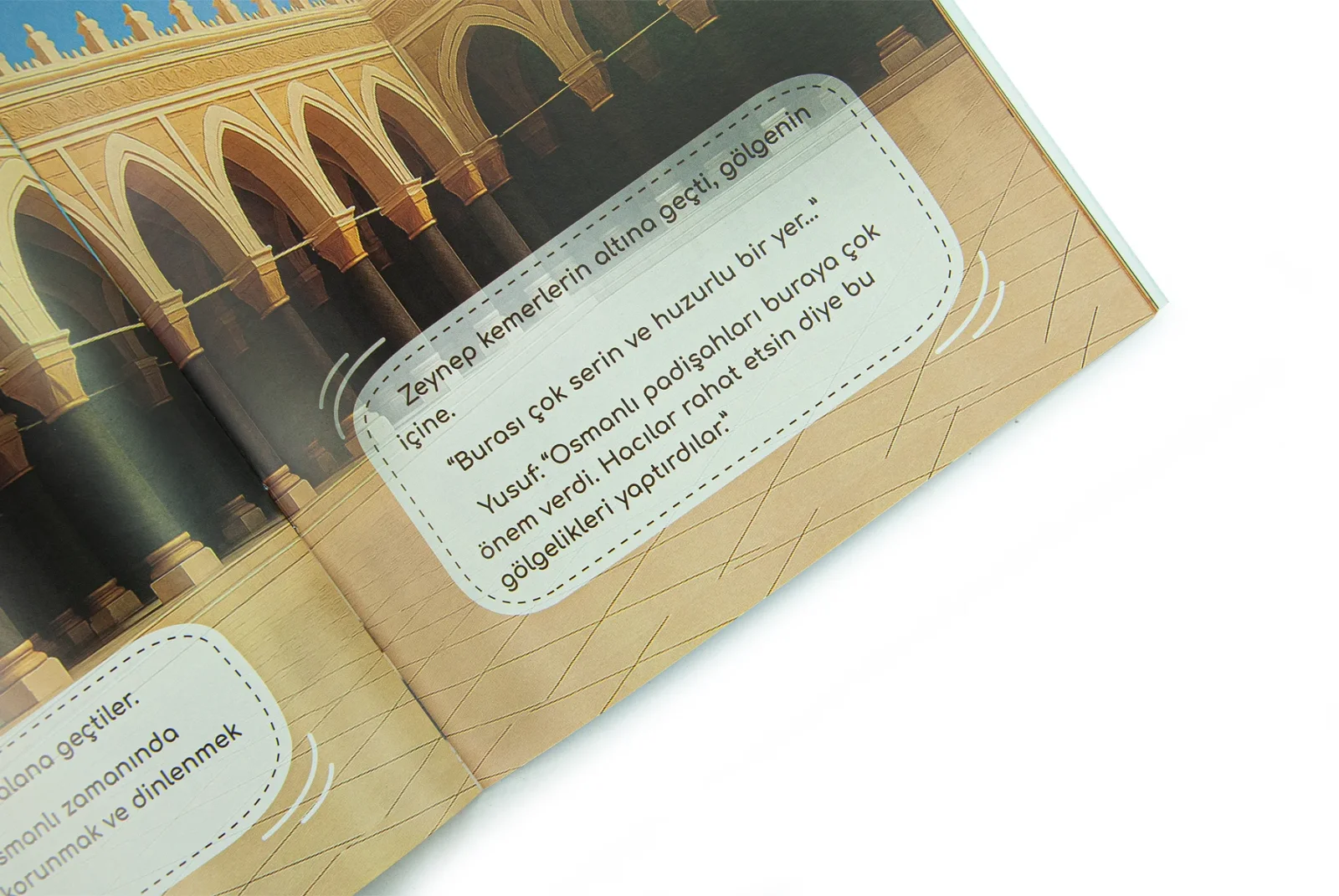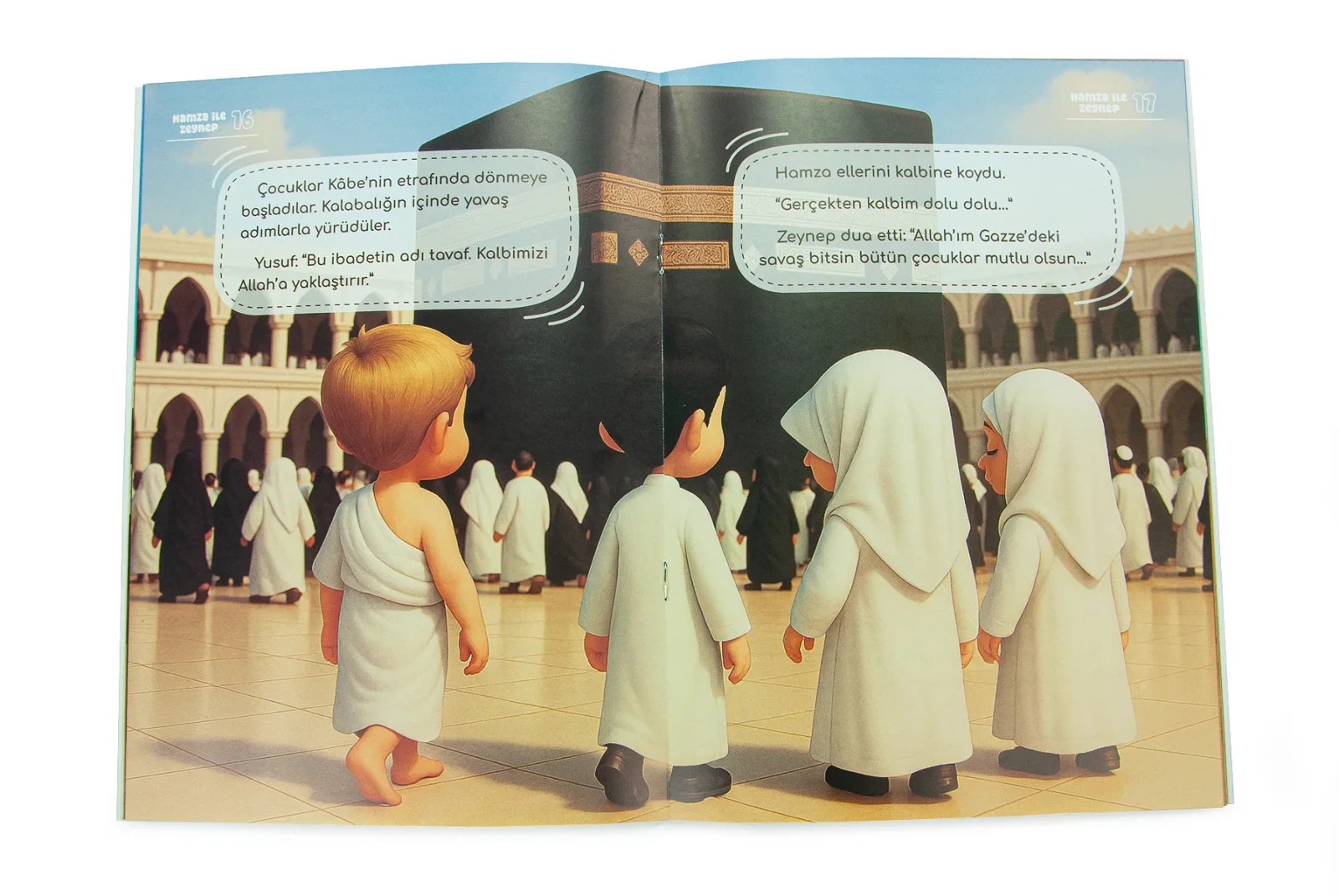 Mekke Ziyareti: Kâbe, Makam-ı İbrahim, Hacerülesved, Zemzem Kuyusu ve Osmanlı revakları tanıtılıyor; çocuklar tavaf heyecanını paylaşıyor.