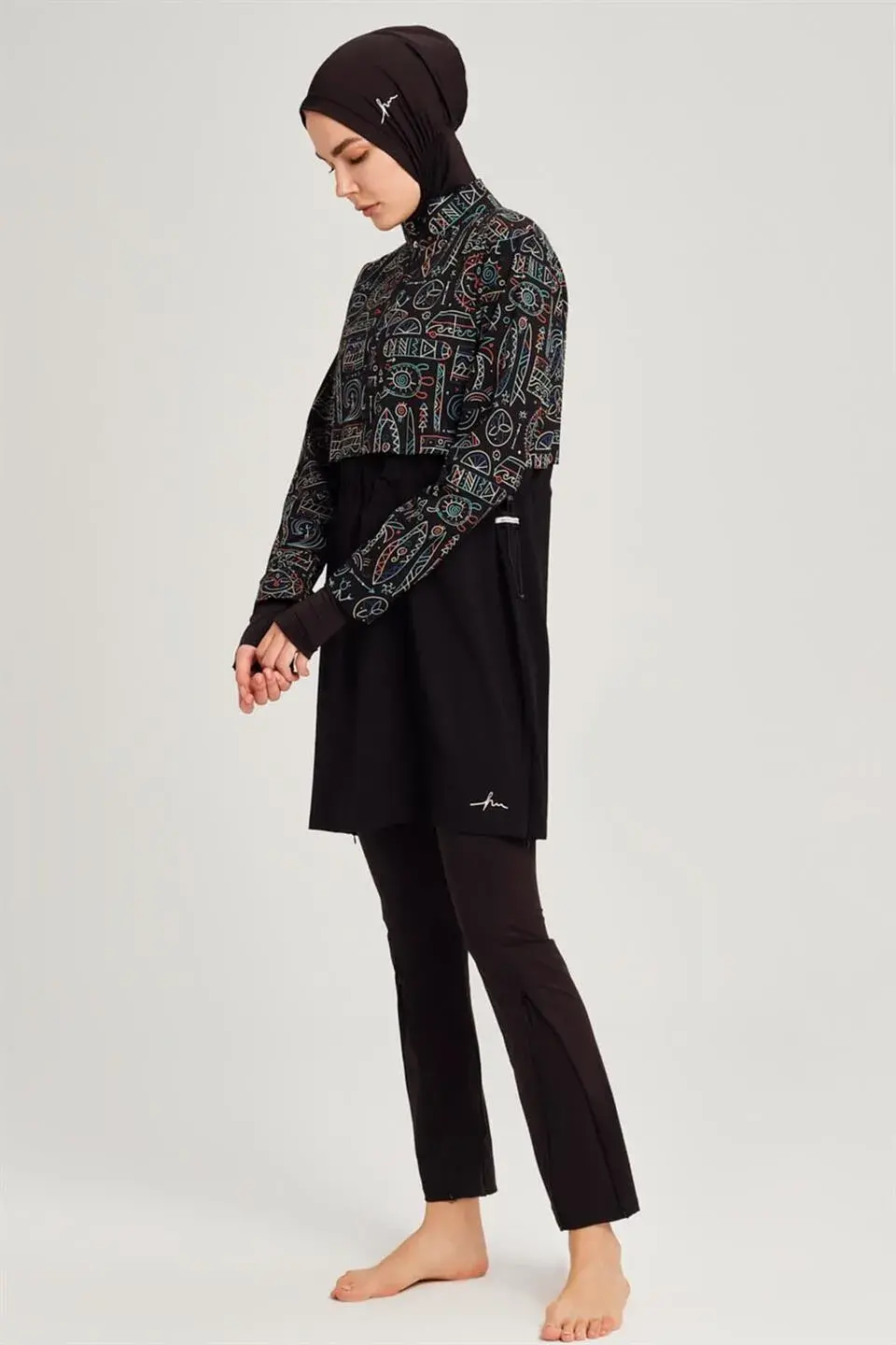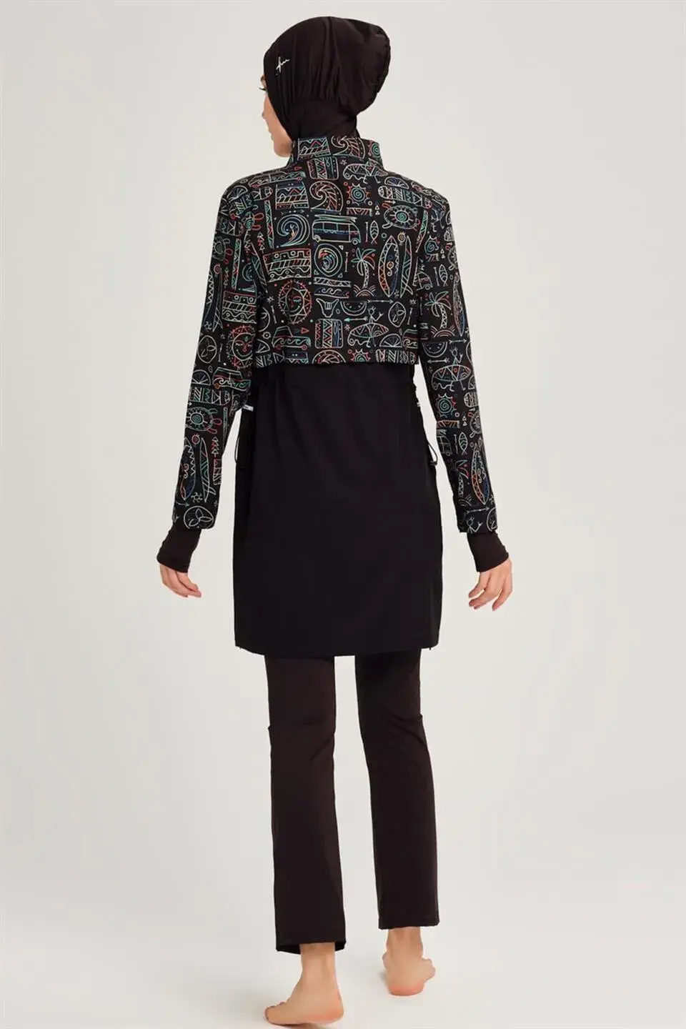Haşema Esila Desenli Tam Kapalı Tesettür Mayo HSM-2934 Siyah-Yeşil