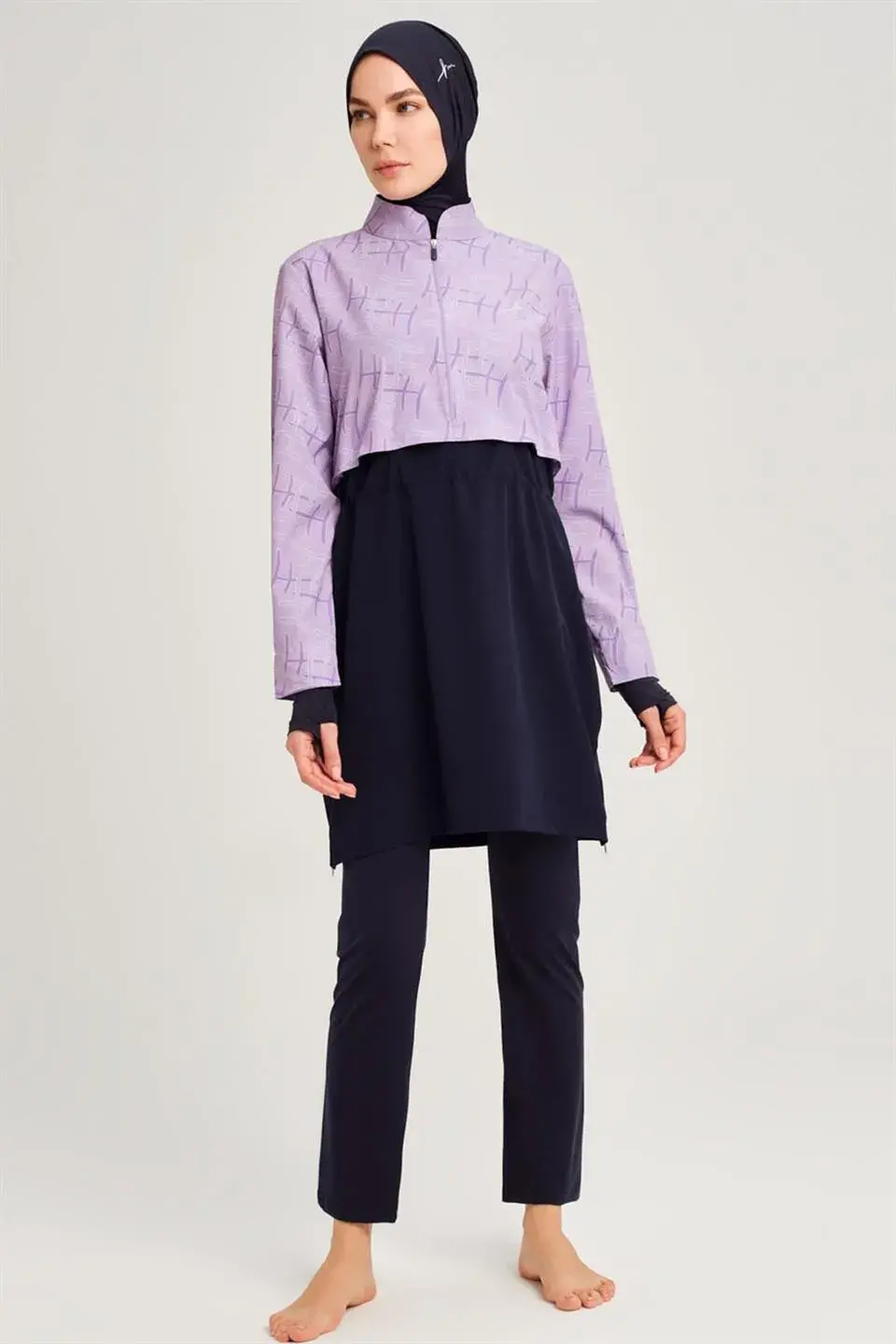 Haşema Esila Monogram Patterned Fully Covered Hijab Swimsuit HSM-2934 Lilac