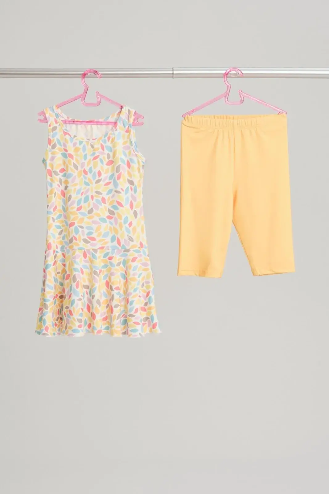 Haşema Gülce Sıfır Kol Etekli Sarı Yeşil Kız Çocuk Mayo Takımı HSM-3045