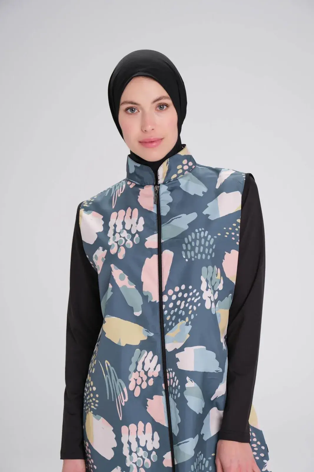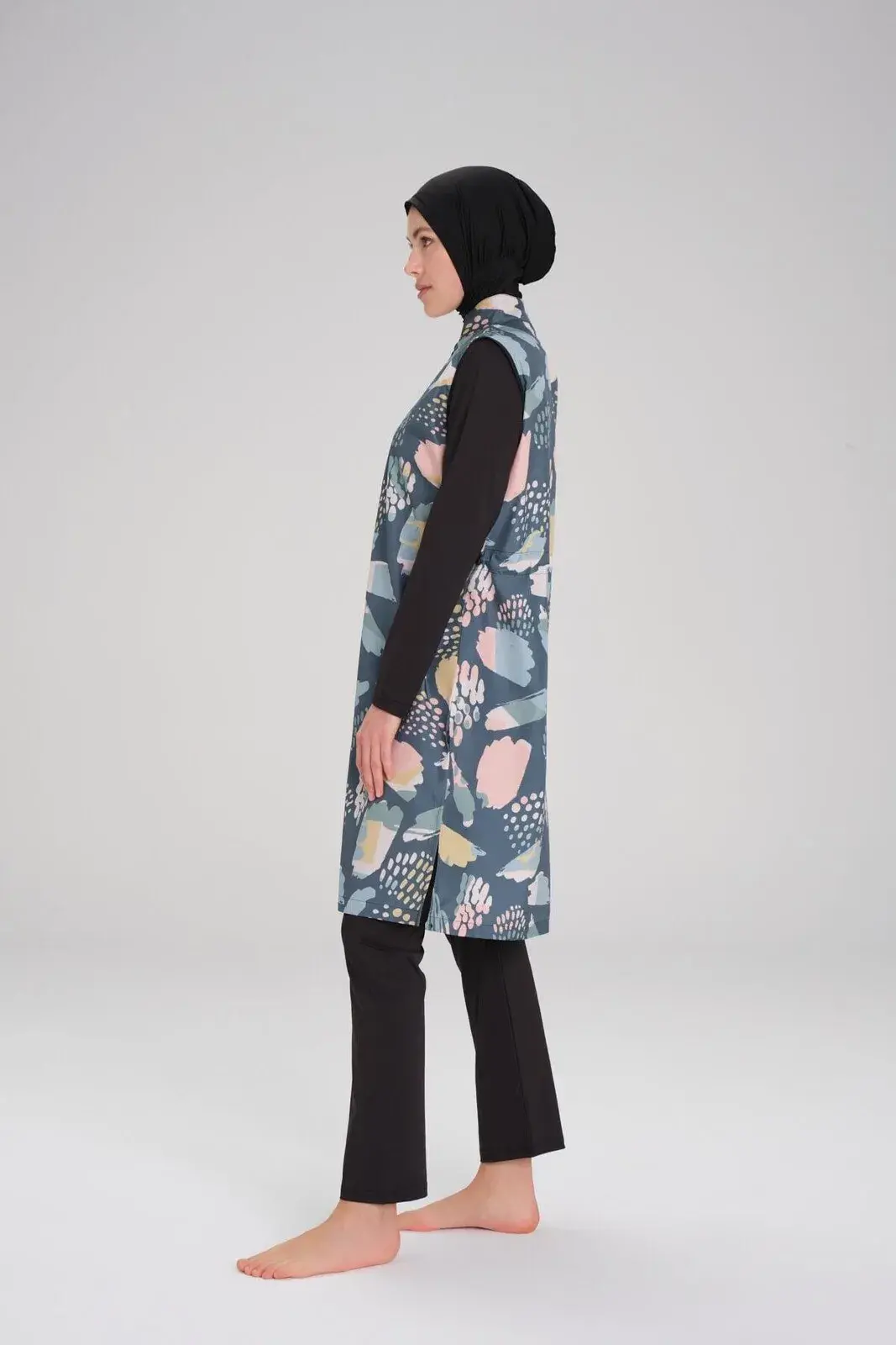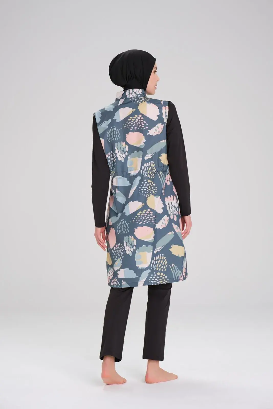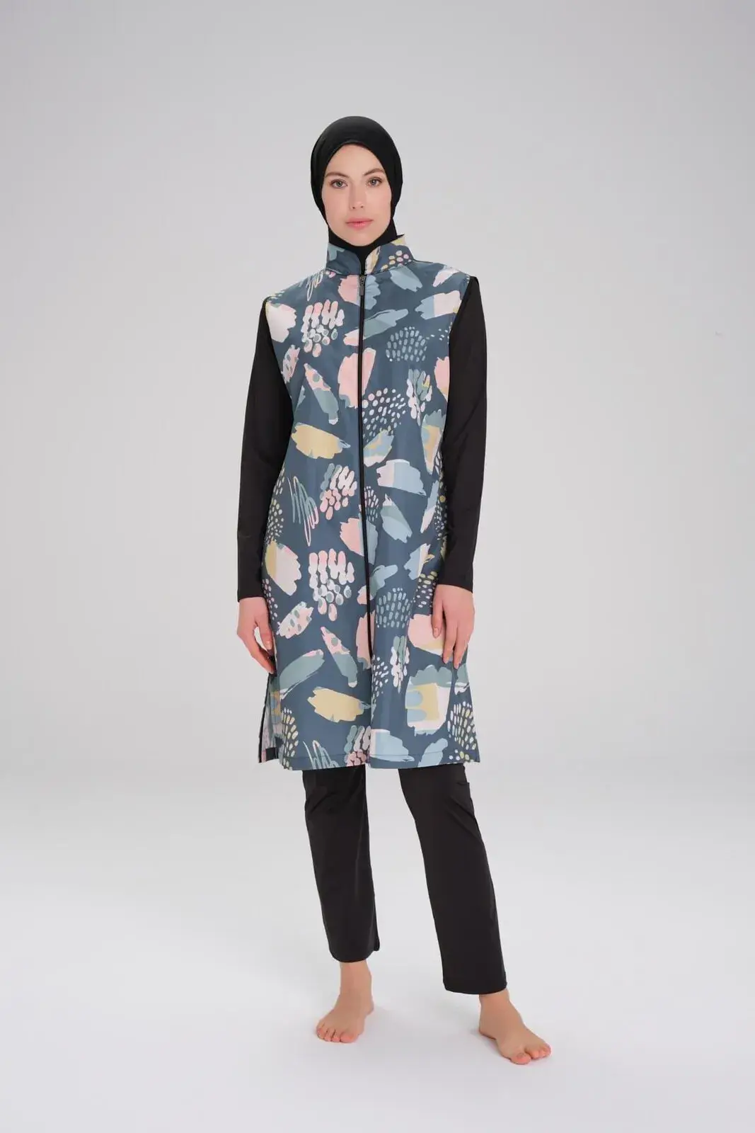 Haşema Nehar Desenli Siyah Jileli 3 Parça Tam Kapalı Tesettür Mayo Takımı 2270