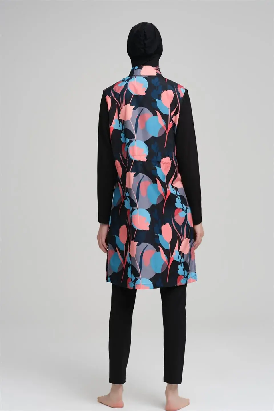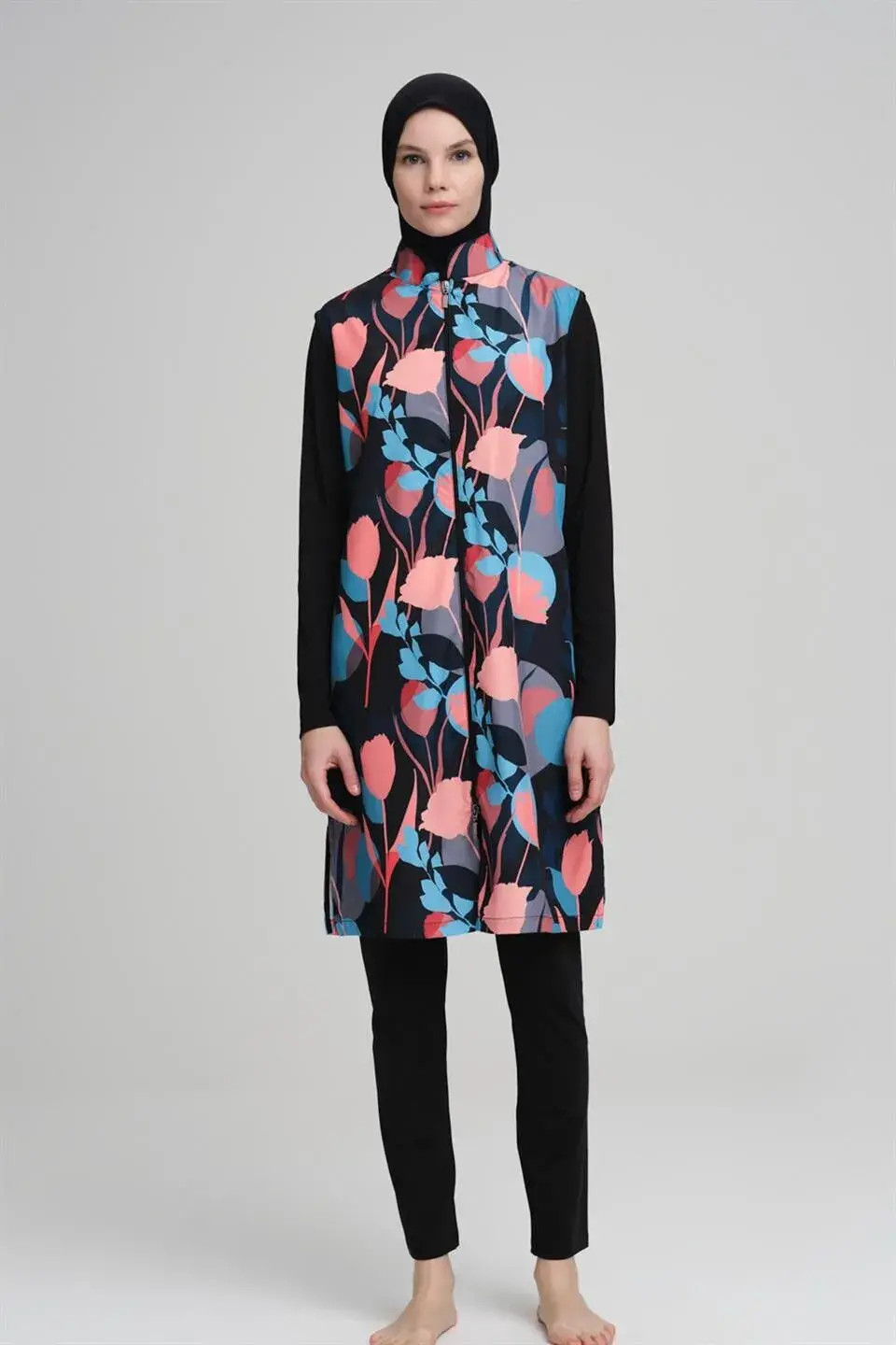 Haşema Nehar Renkli Çiçek Desenli Siyah Jileli Tam Kapalı Tesettür Mayo NHR-22-05