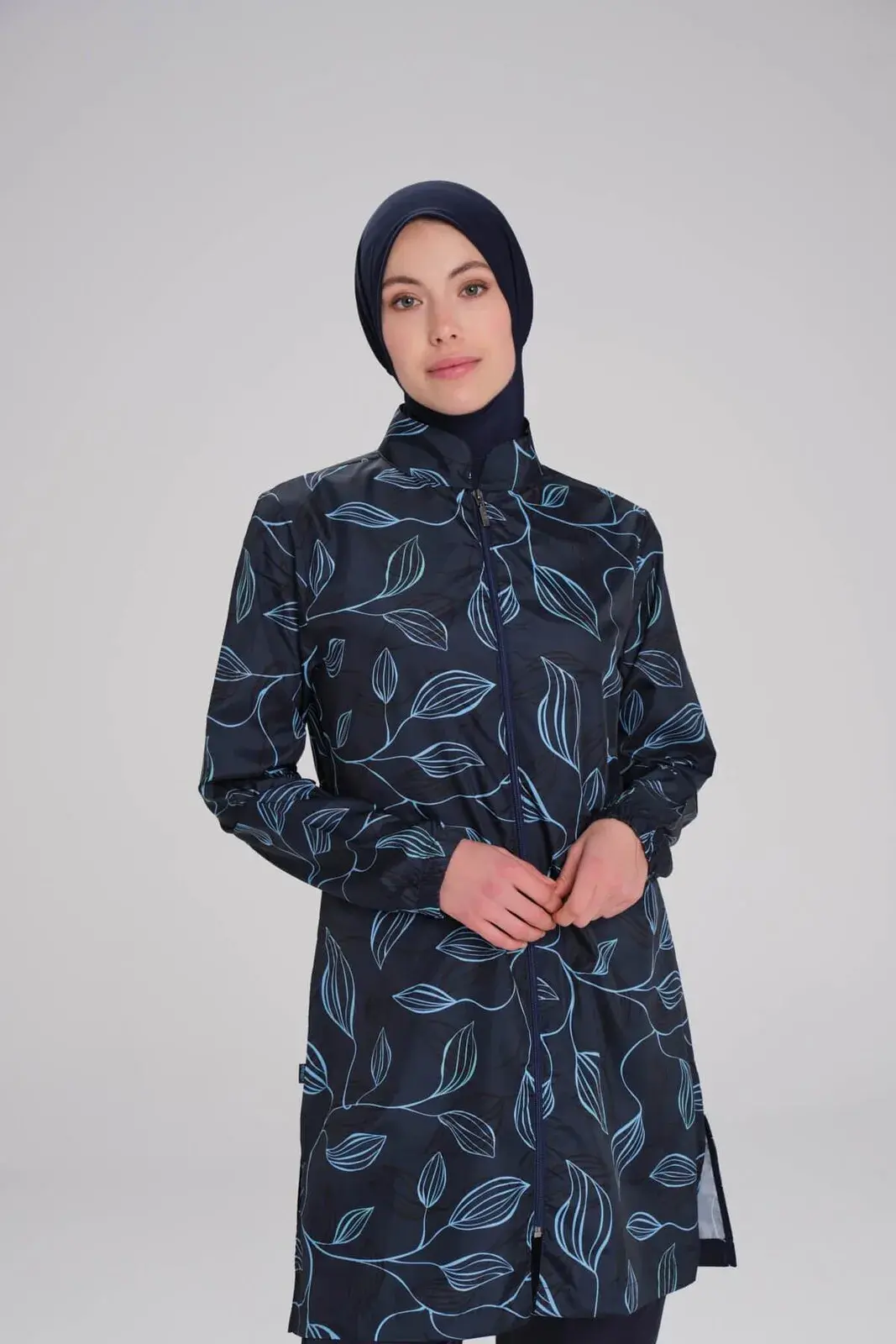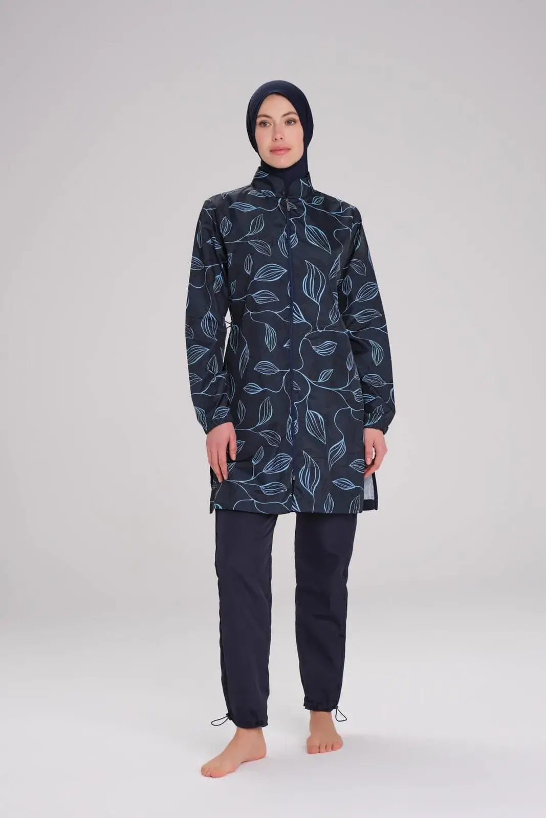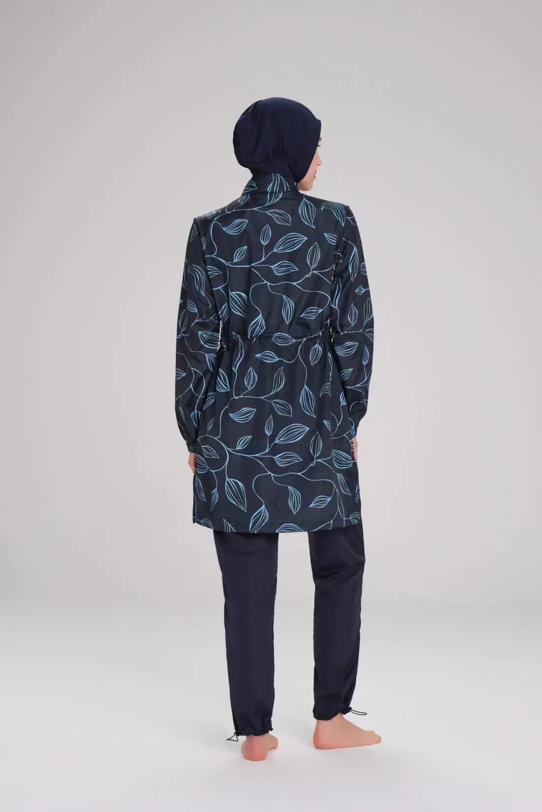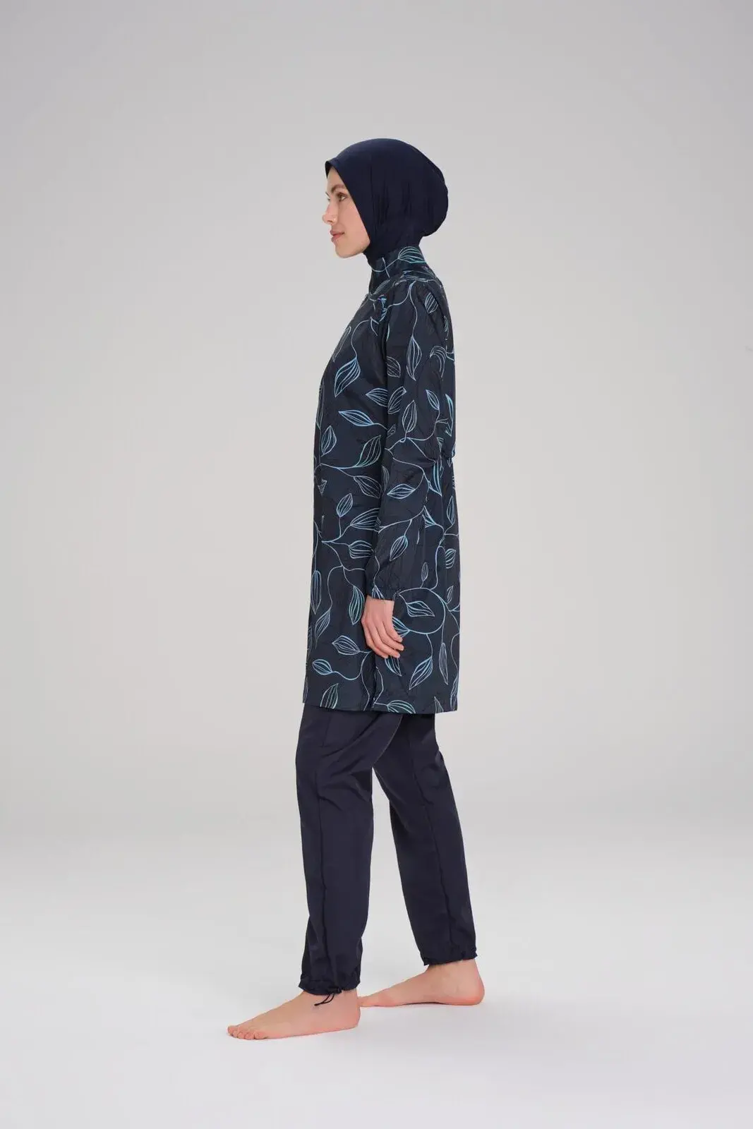 Haşema Nehar Yaprak Desenli Lacivert Dokuma 3 Parça Tesettür Mayo Takımı 2259