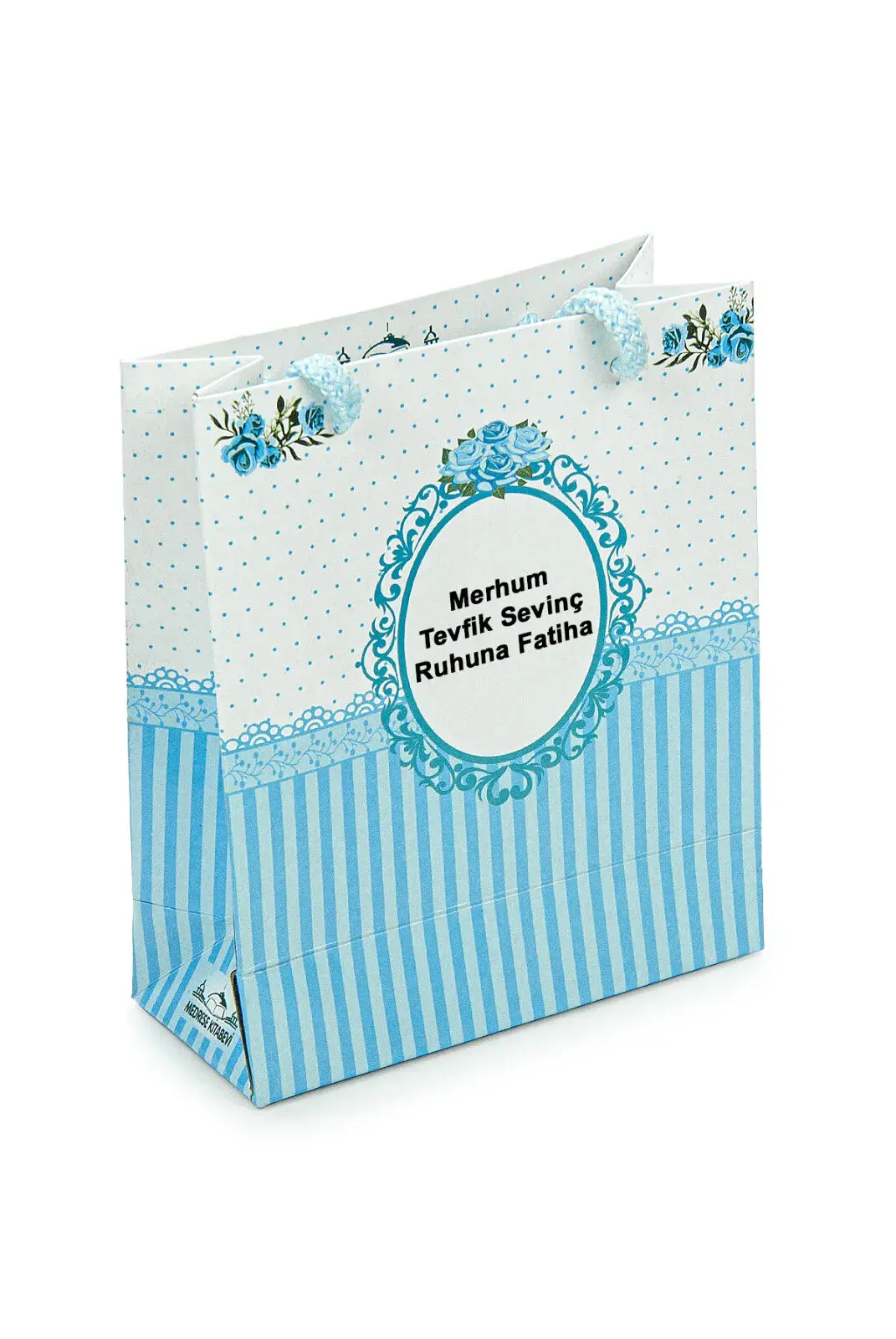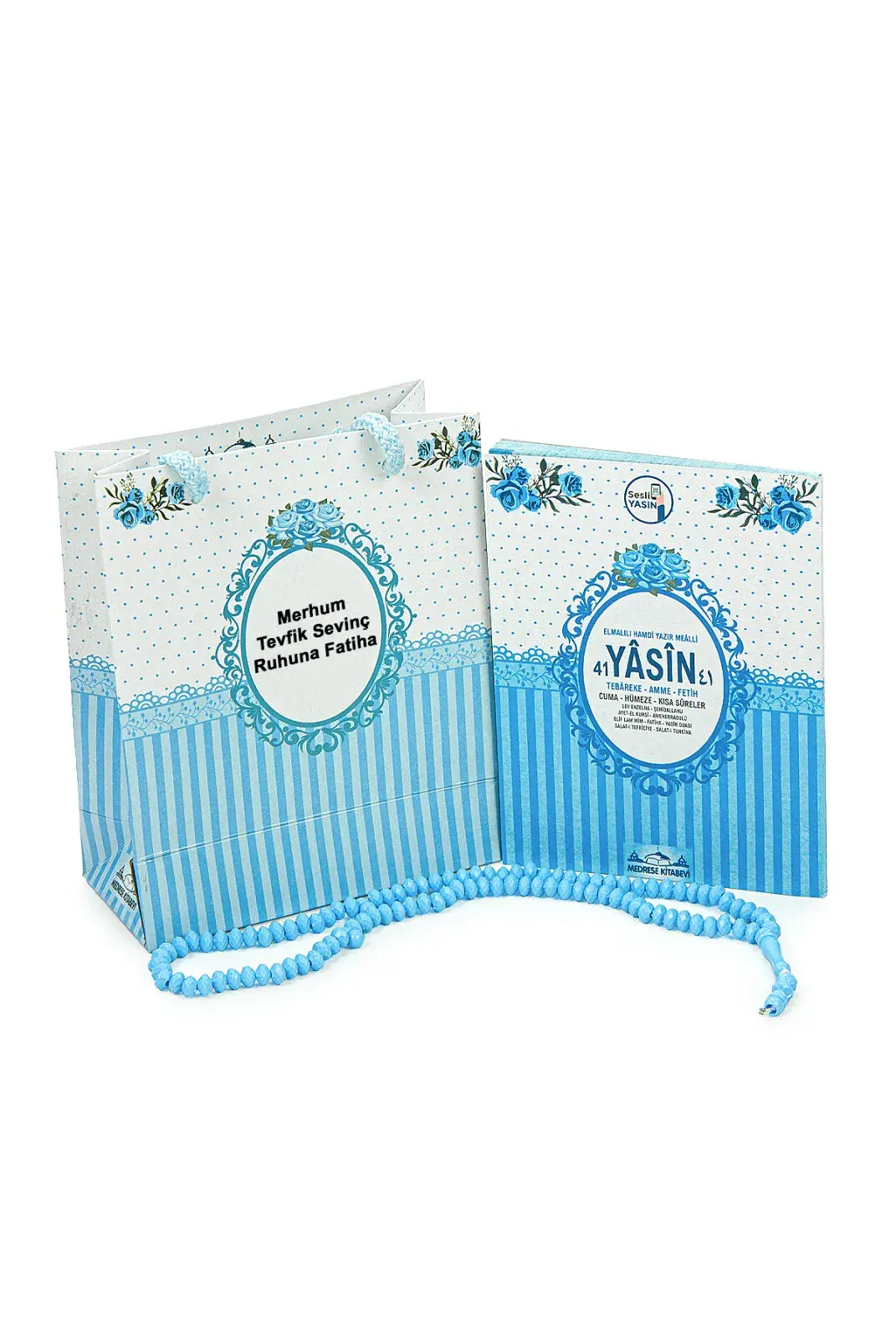 Hediyelik 3'lü Mevlüt Seti İsme Özel Etiketli Çantalı Tesbihli, 80 Sayfa Yasin Kitabı - Mavi Renk