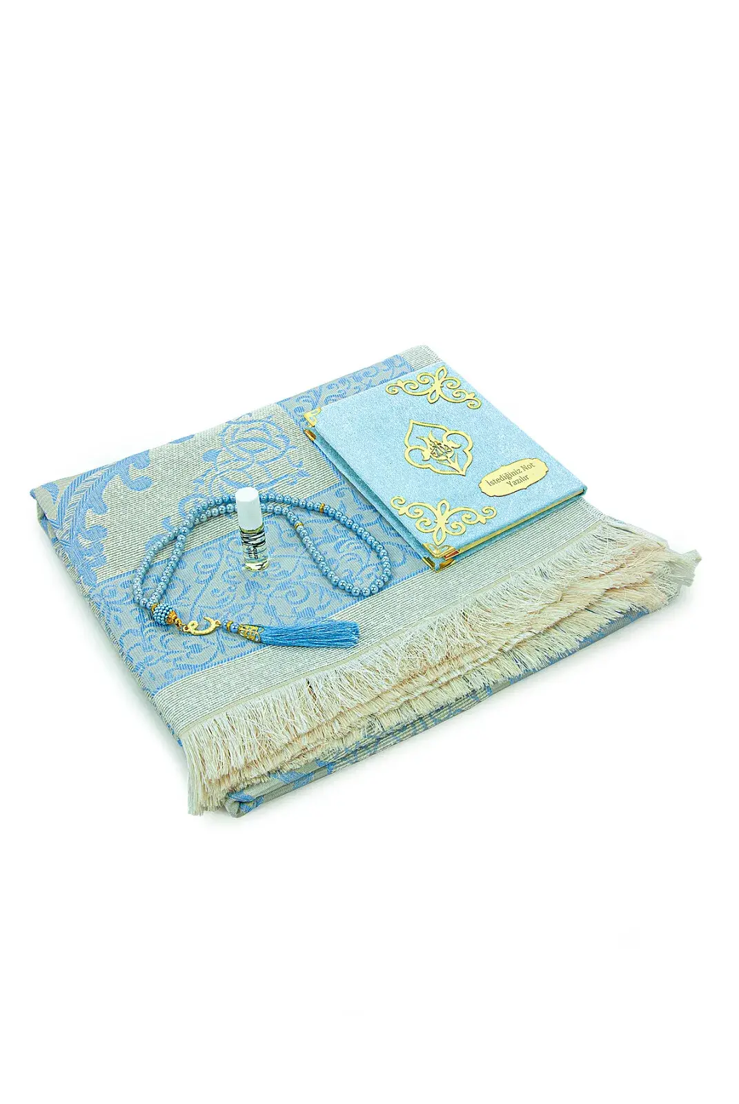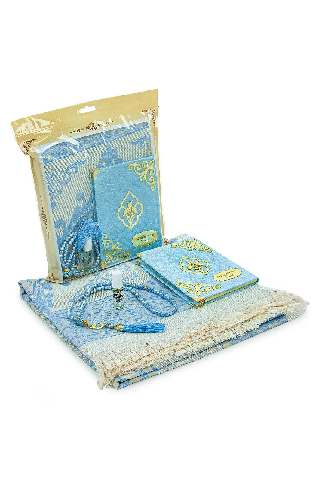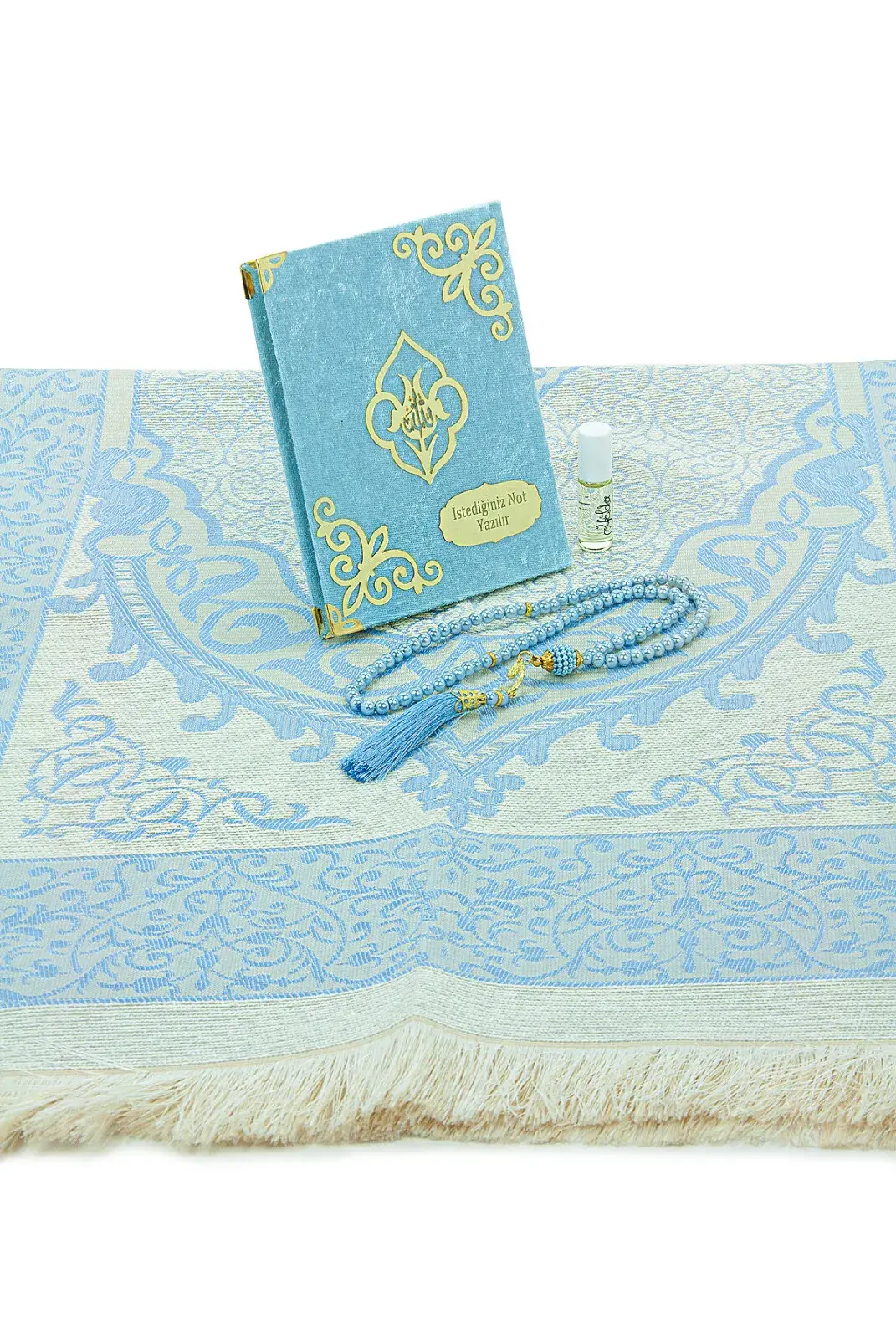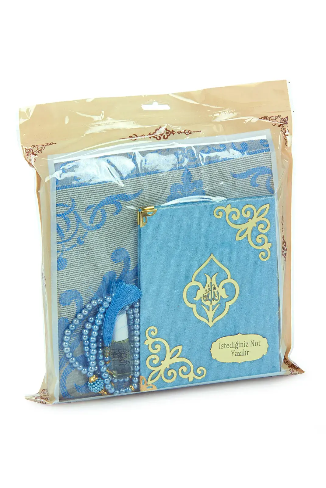 Hediyelik 4 Parça Mevlüt Seti İsme Özel Kadife Kaplı Yasin, Tesbihli Seccade Seti - Mavi
