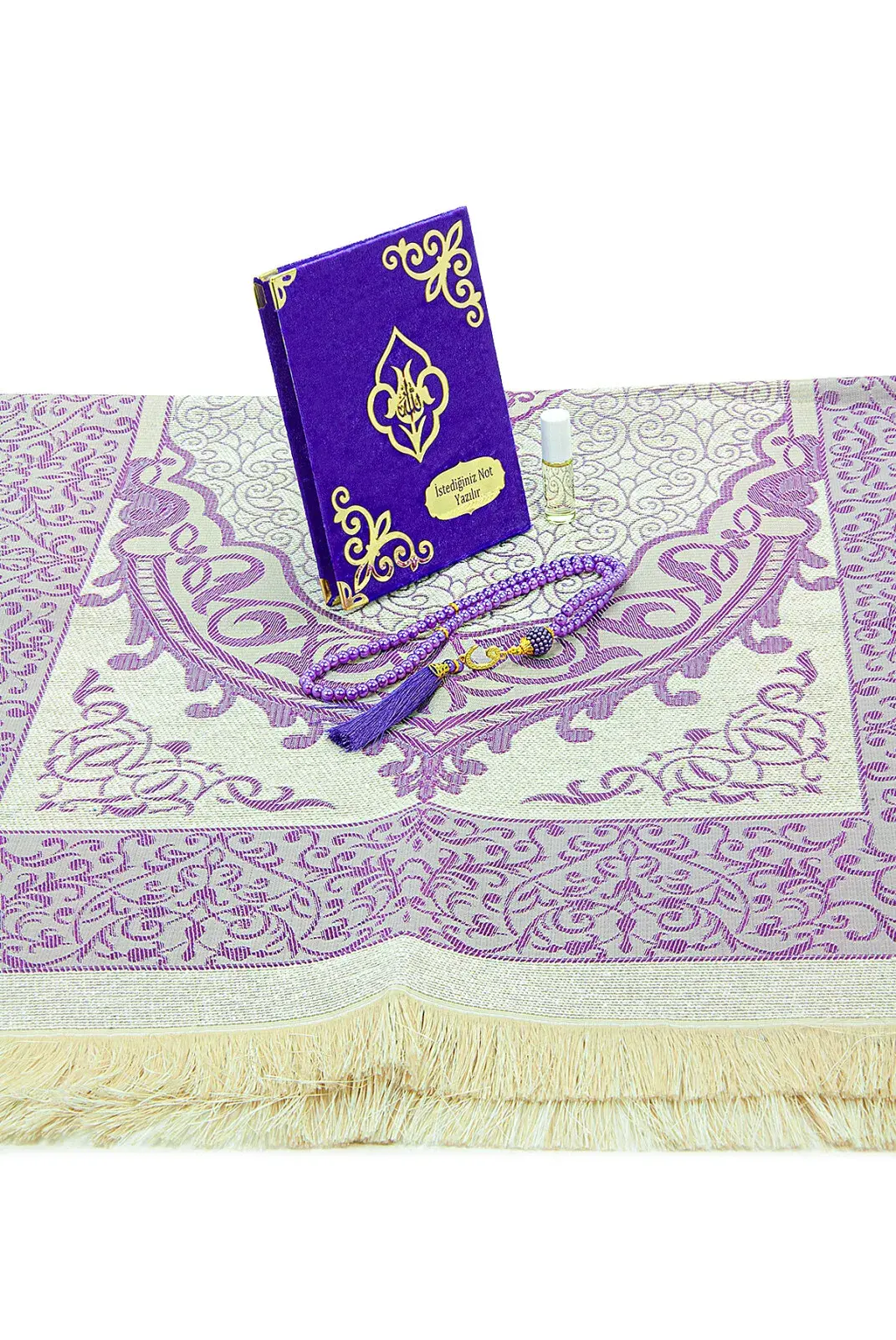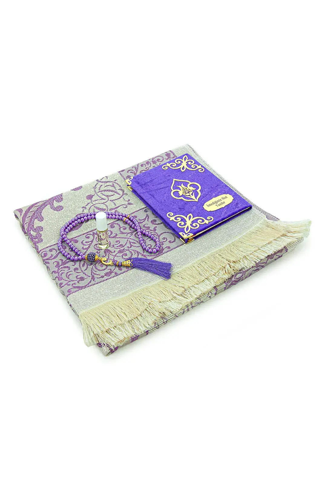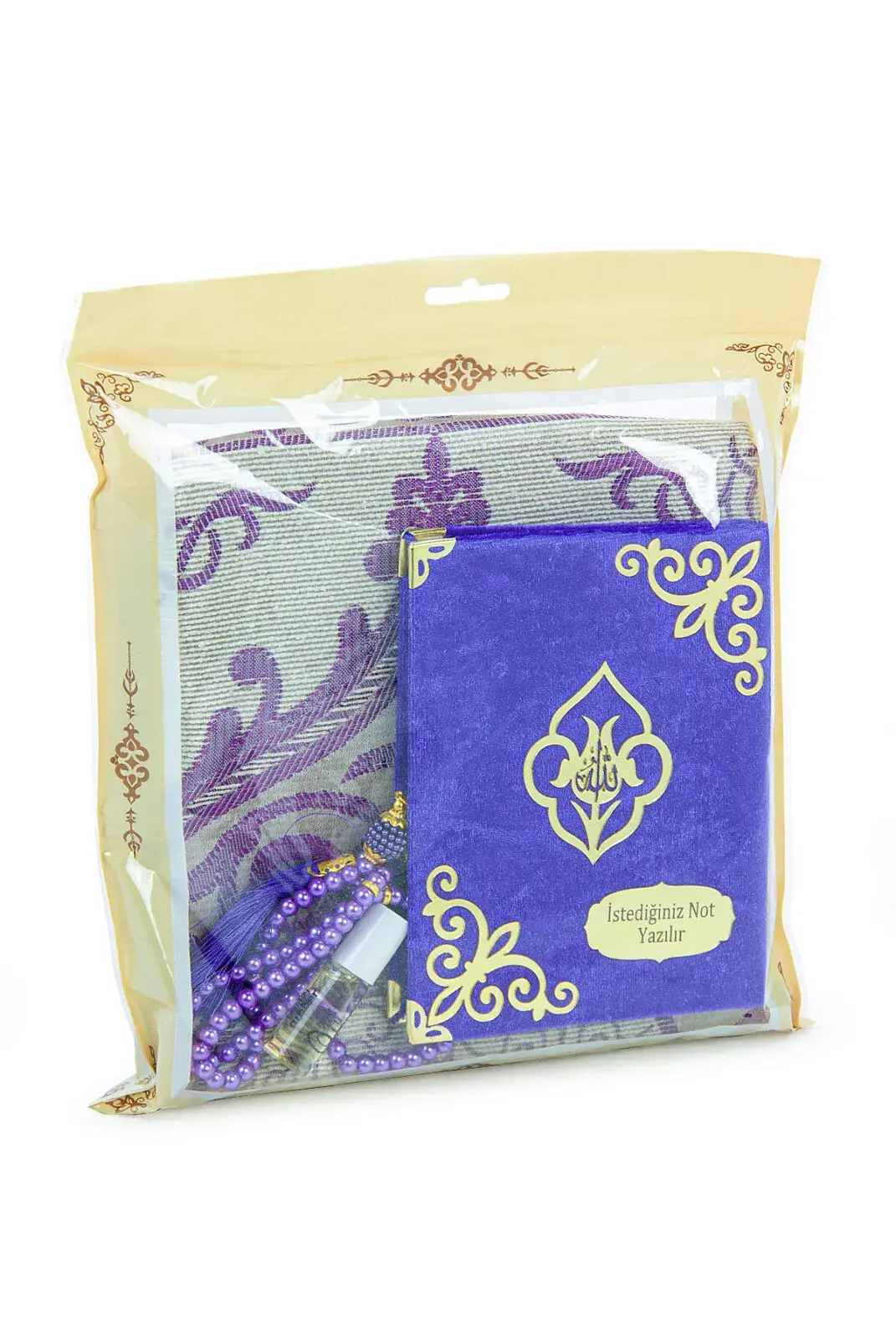 Hediyelik 4 Parça Mevlüt Seti İsme Özel Kadife Kaplı Yasin, Tesbihli Seccade Seti - Mor