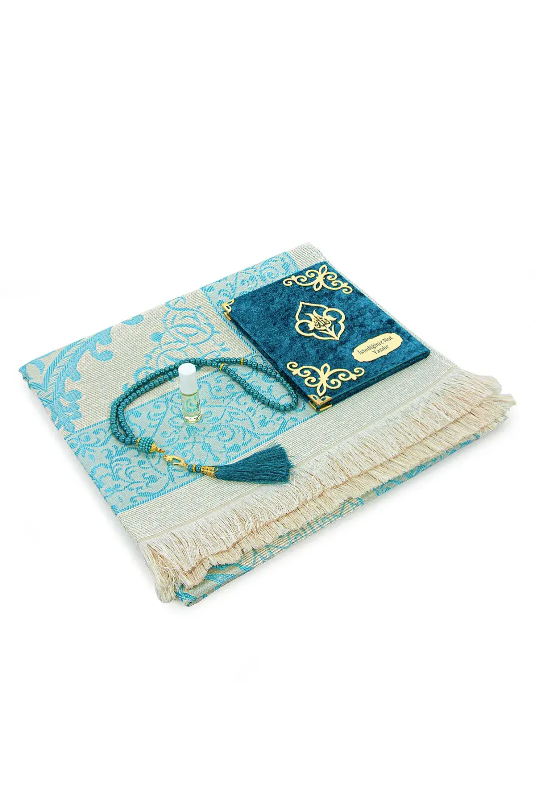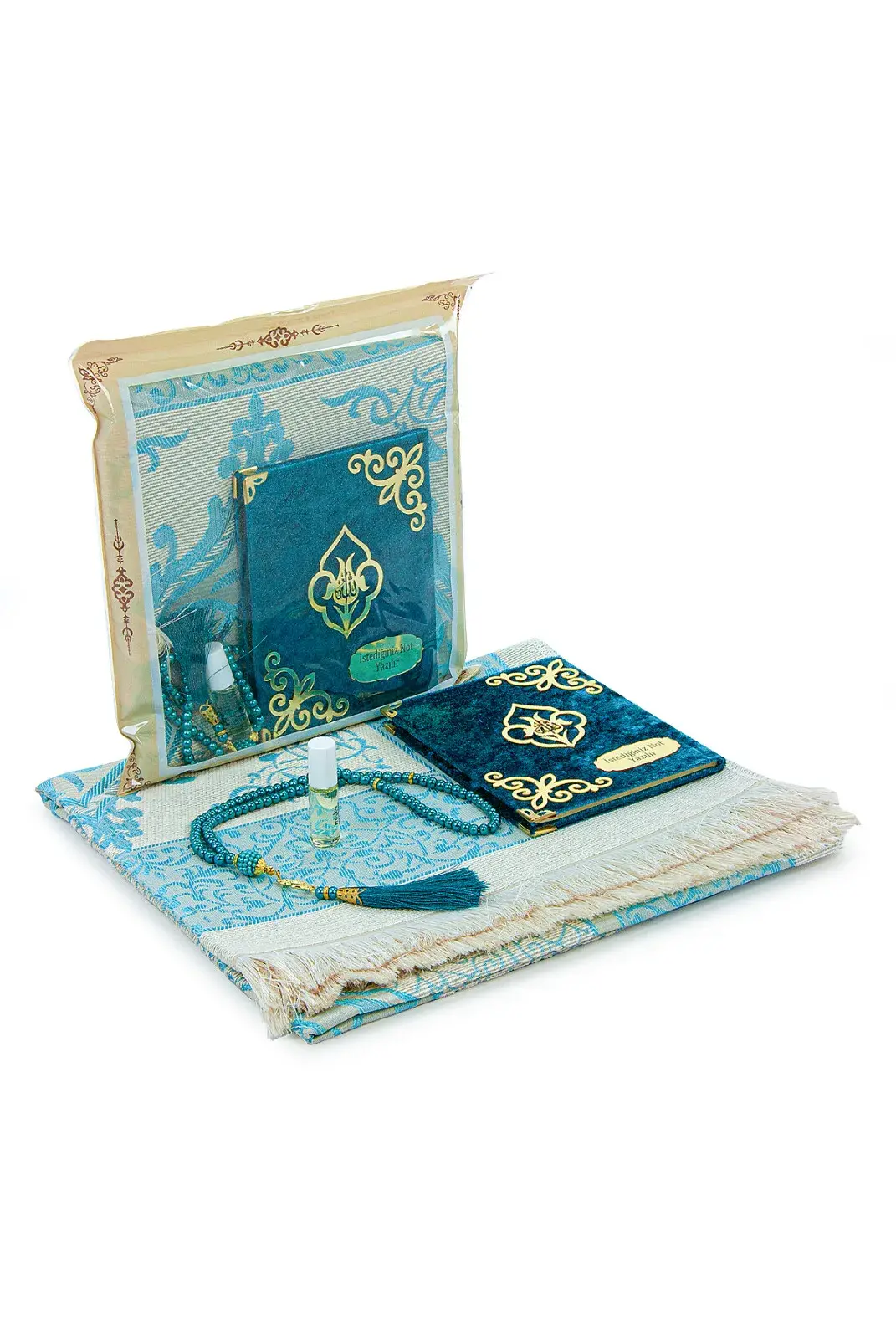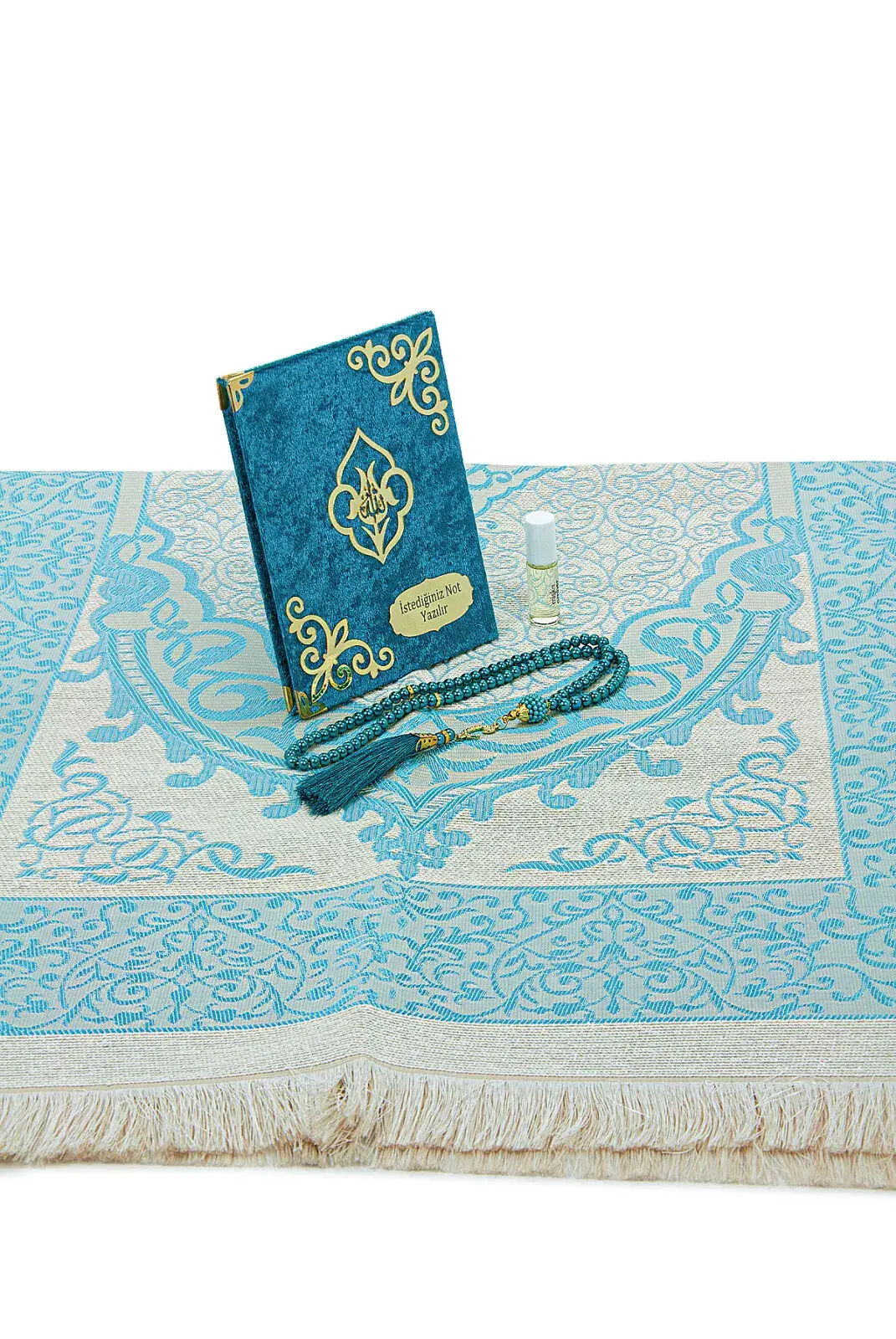 Hediyelik 4 Parça Mevlüt Seti İsme Özel Kadife Kaplı Yasin, Tesbihli Seccade Seti - Turkuaz