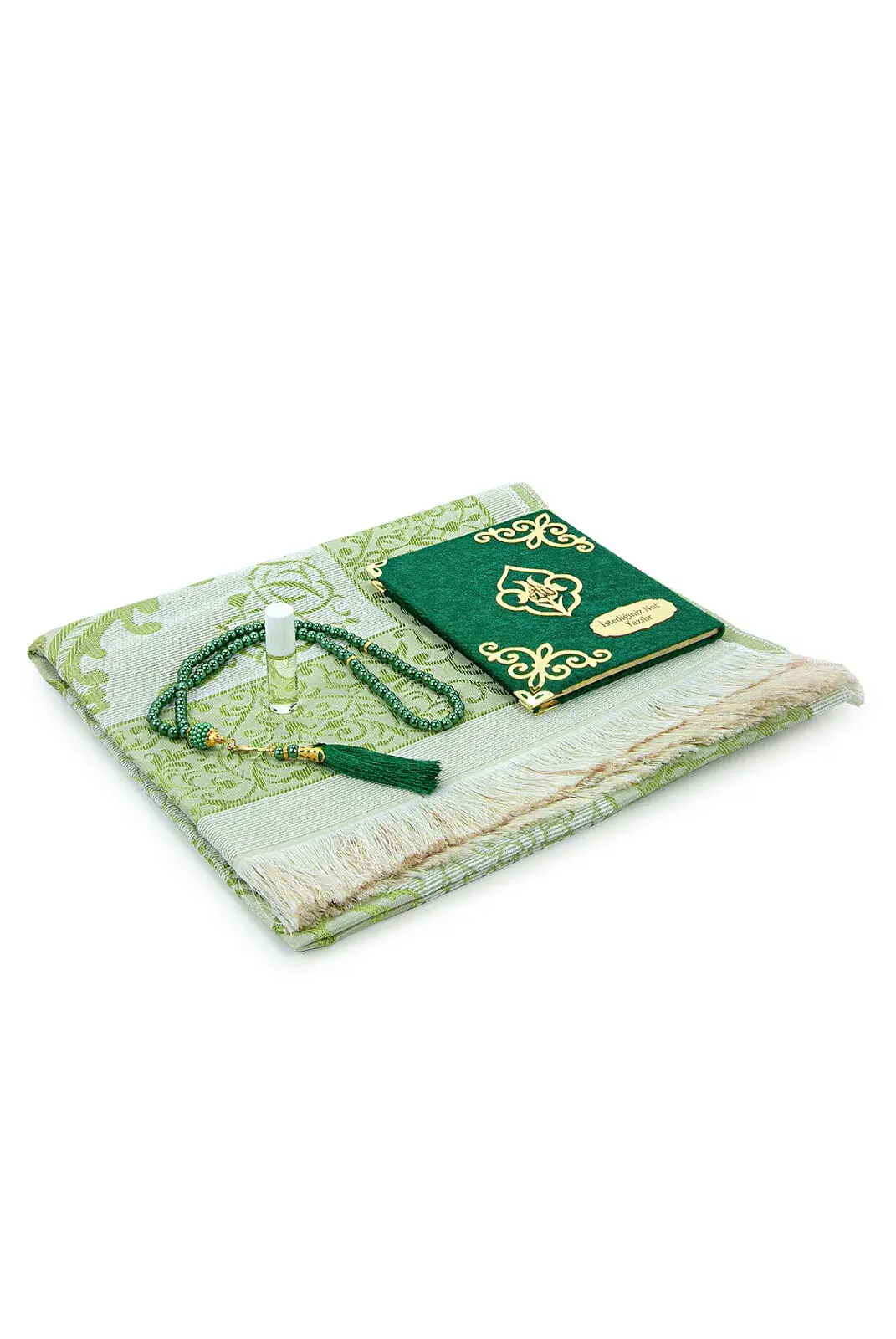 Hediyelik 4 Parça Mevlüt Seti İsme Özel Kadife Kaplı Yasin, Tesbihli Seccade Seti - Yeşil