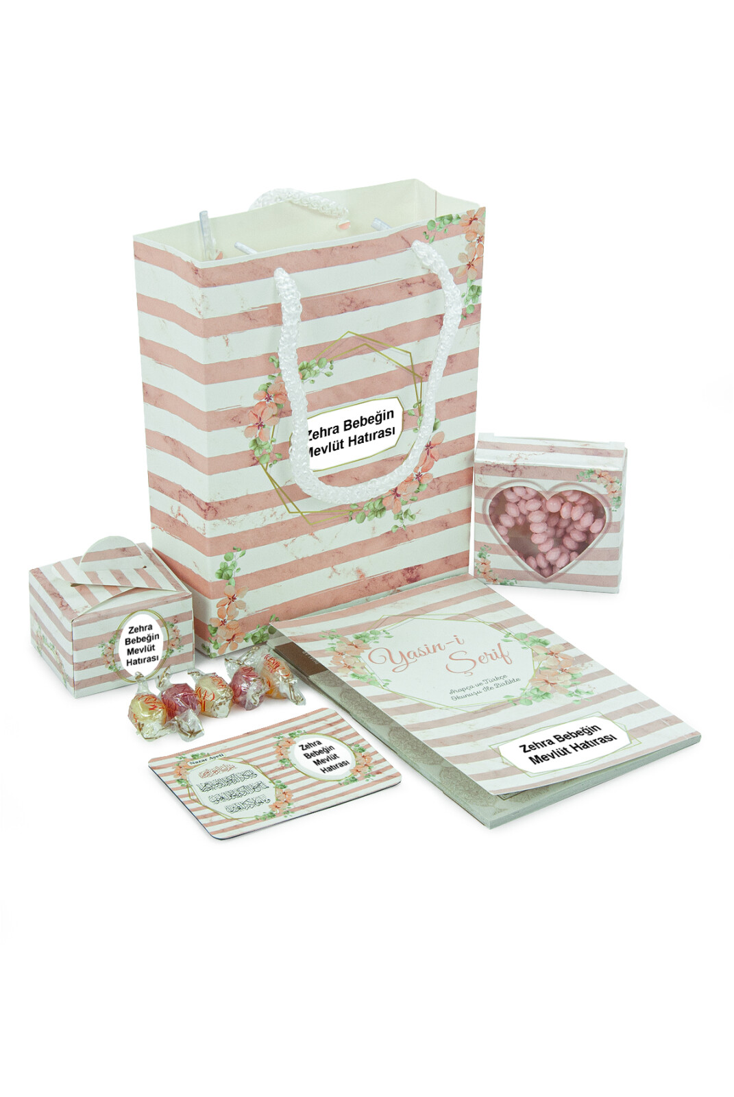 Hediyelik 5'li Mevlüt Seti İsme Özel Çantalı Tesbihli Yasin Kitabı - Pembe