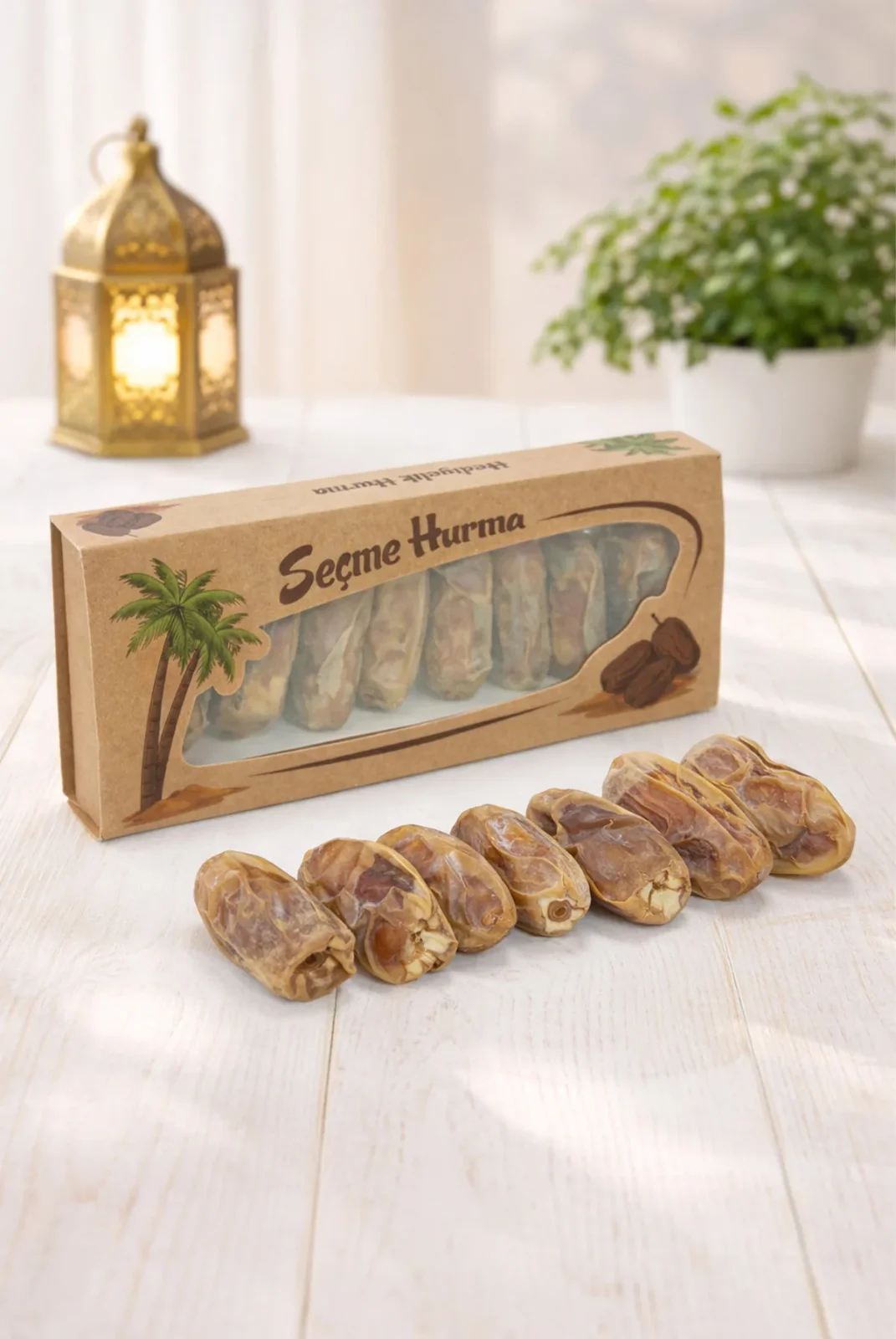 İçerik: Her kutu içerisinde titizlikle seçilmiş, iki renkli 7 adet Medine Sugai hurması bulunmaktadır.