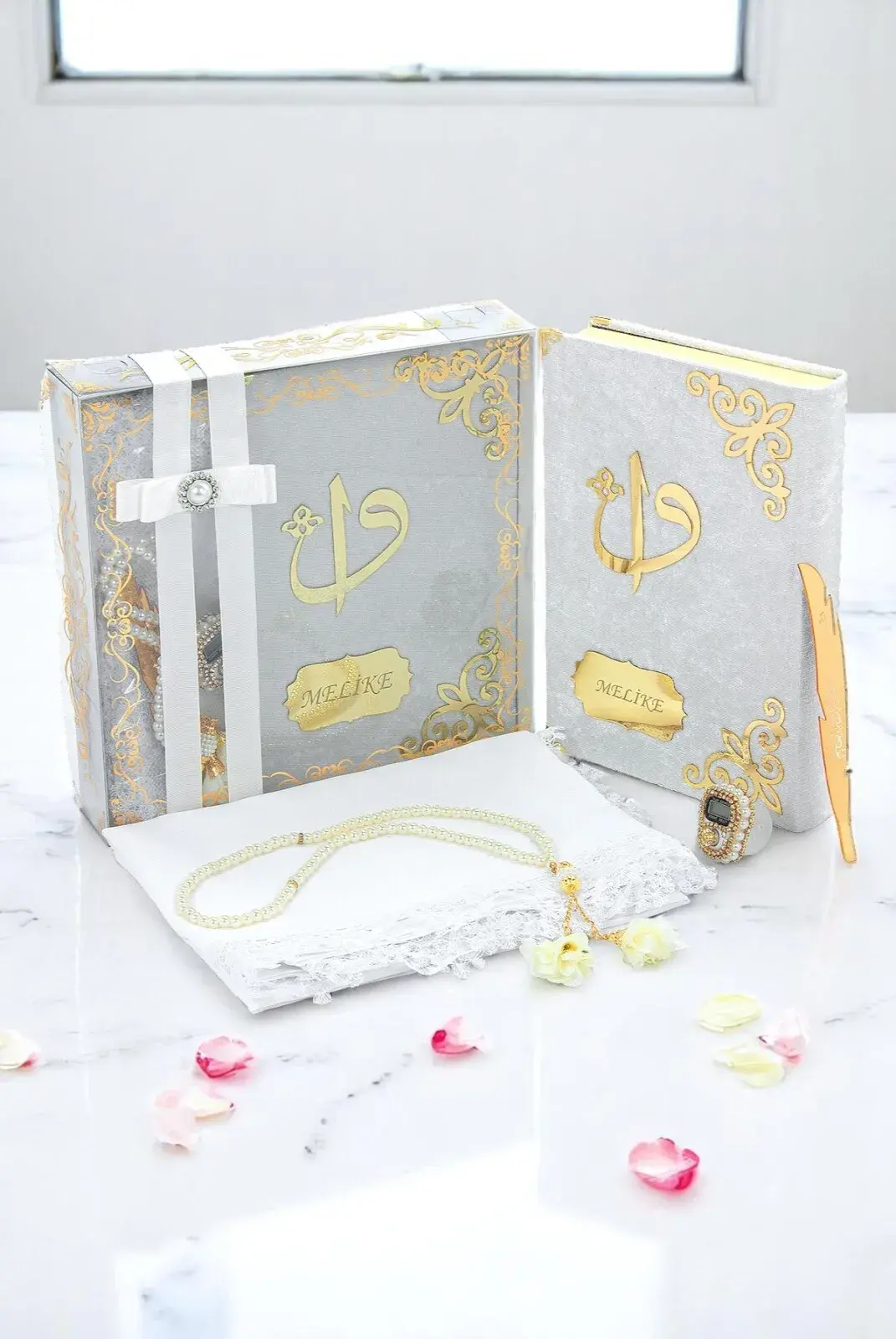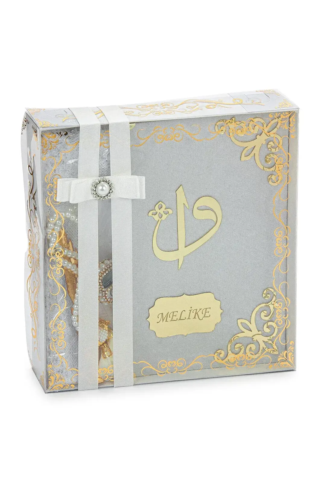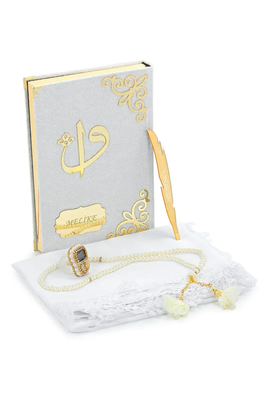 Hediyelik İsme Özel Kuranı Kerim Seti Şal Tesbih Zikirmatik Beyaz