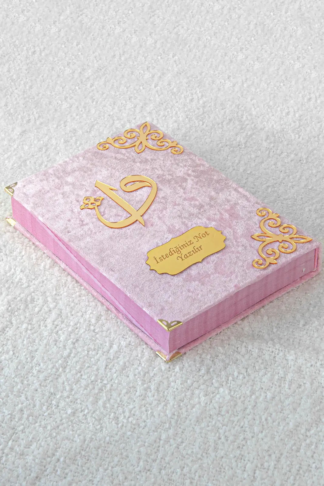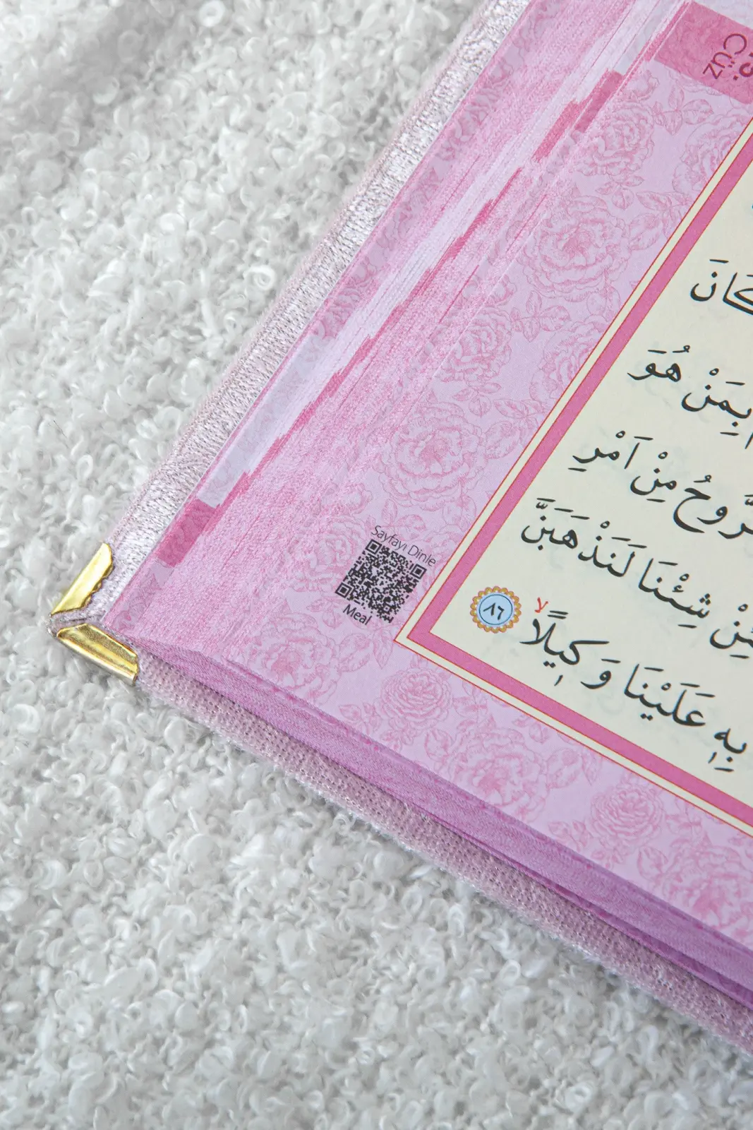 Manevi değeri yüksek bu hediyelik Kuran-ı Kerim, pembe kadife kaplı şık tasarımıyla öne çıkar.
