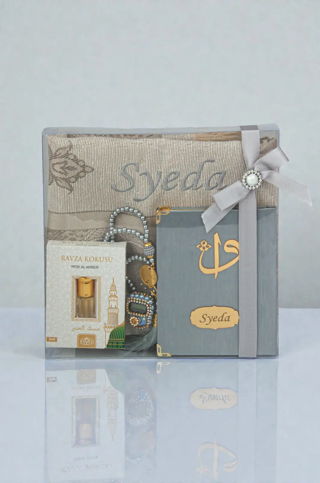 Hediyelik Kişiye Özel İsimli Seccade Seti - Yasin Kitabı, Tesbih, Zikirmatik, Esans - Gri