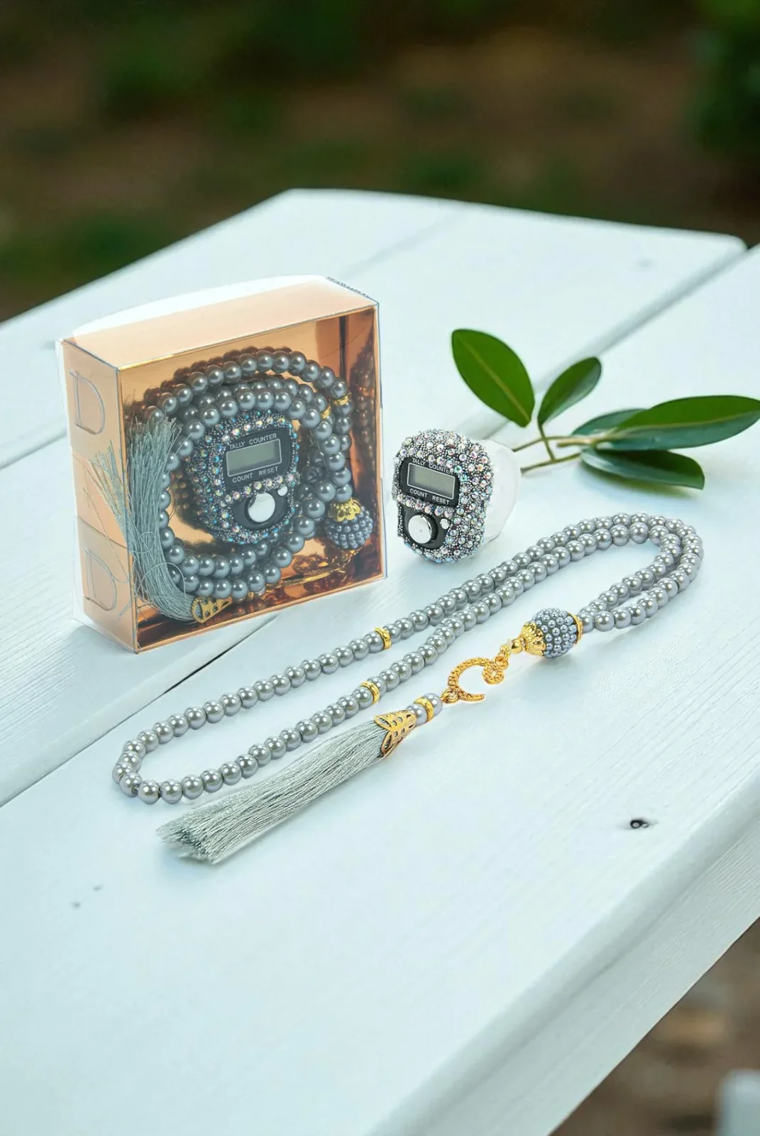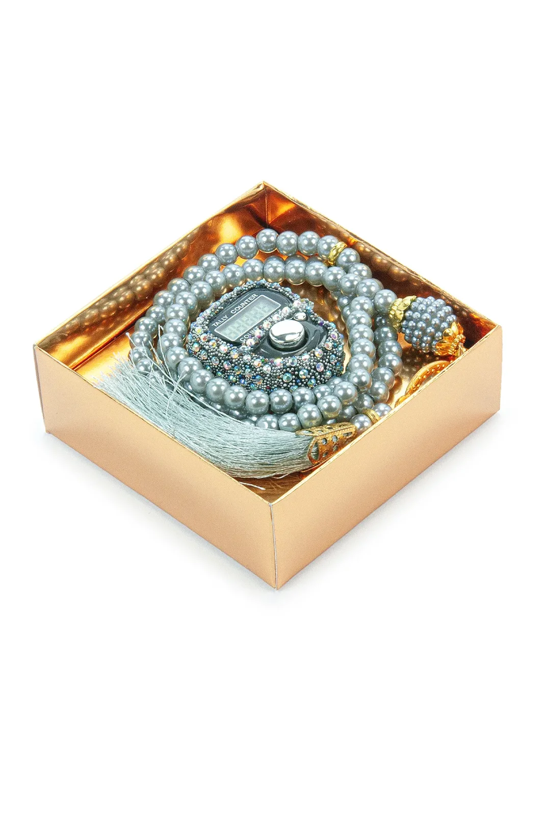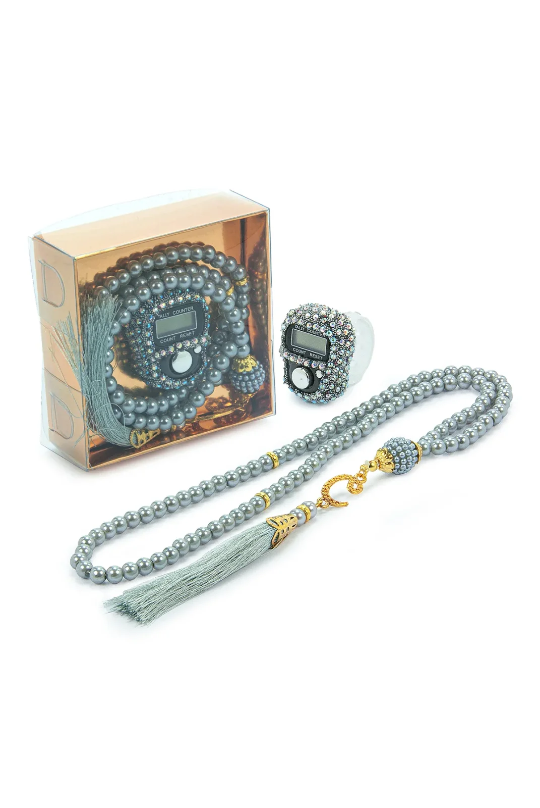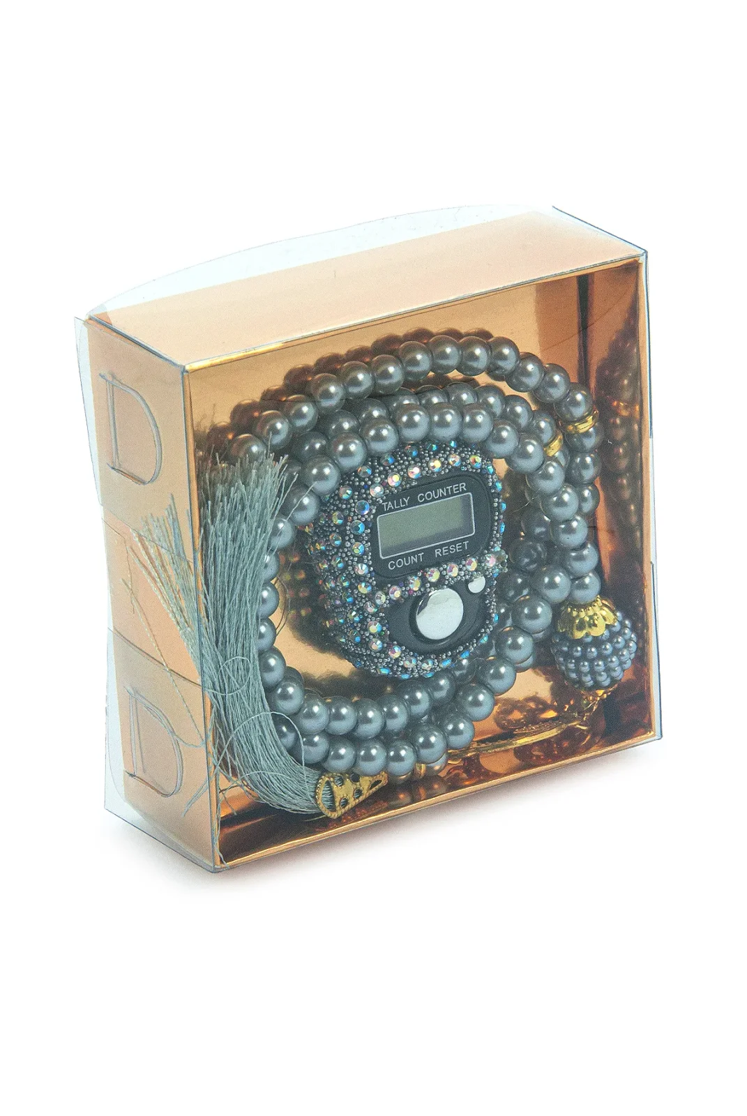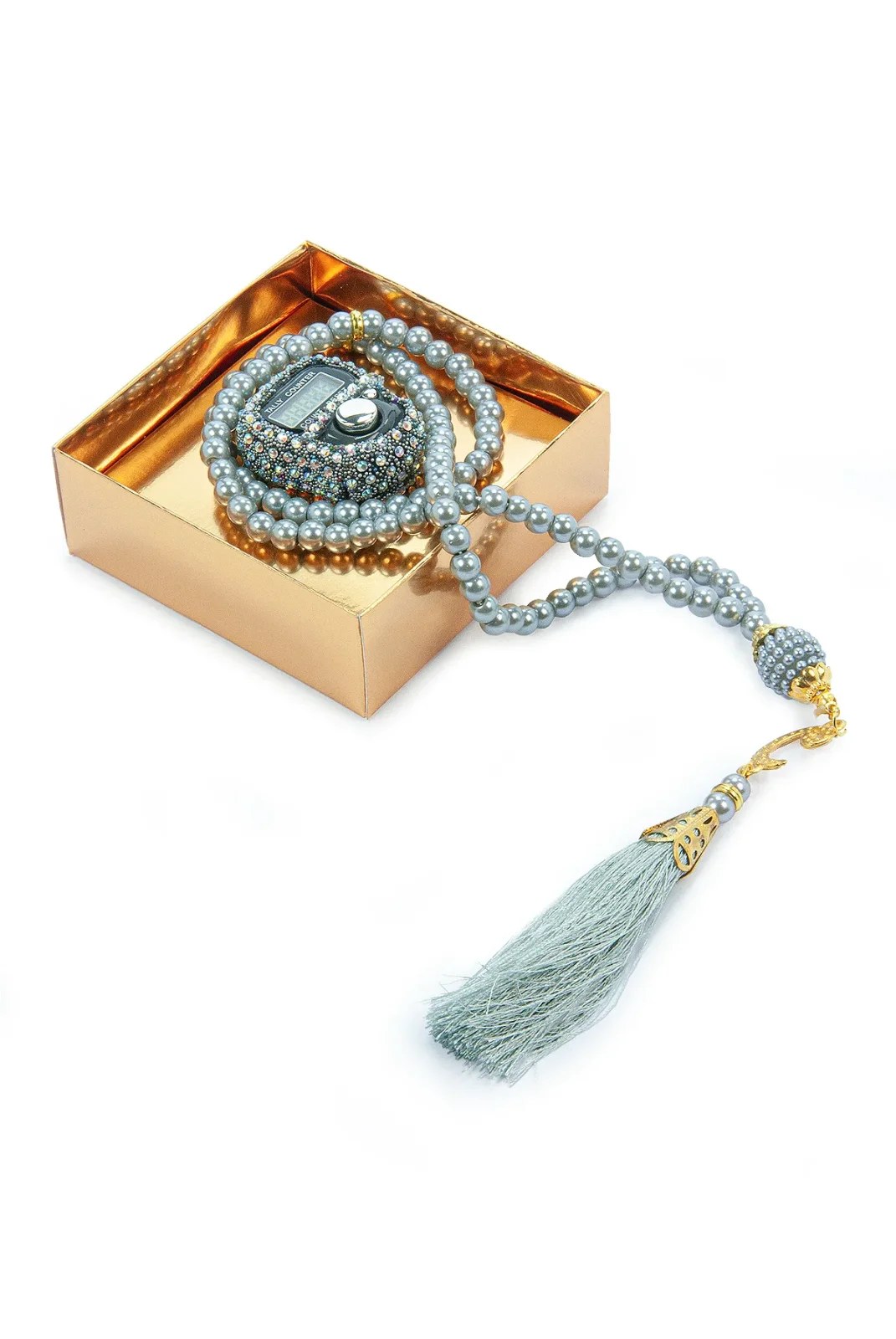 Hediyelik Taşlı Zikirmatik ve 99 lu İnci Tesbih Kutulu Set - Gri