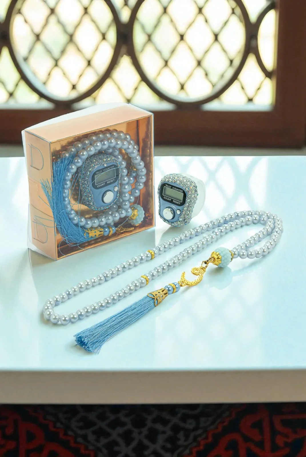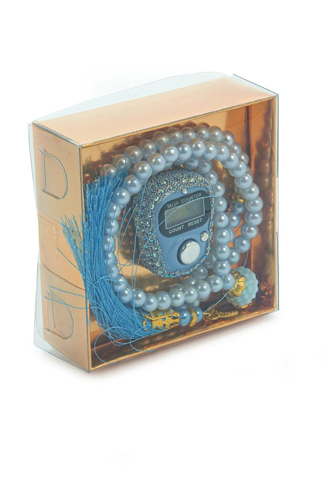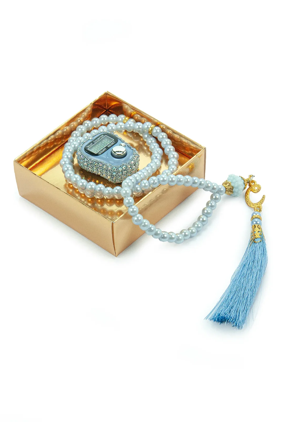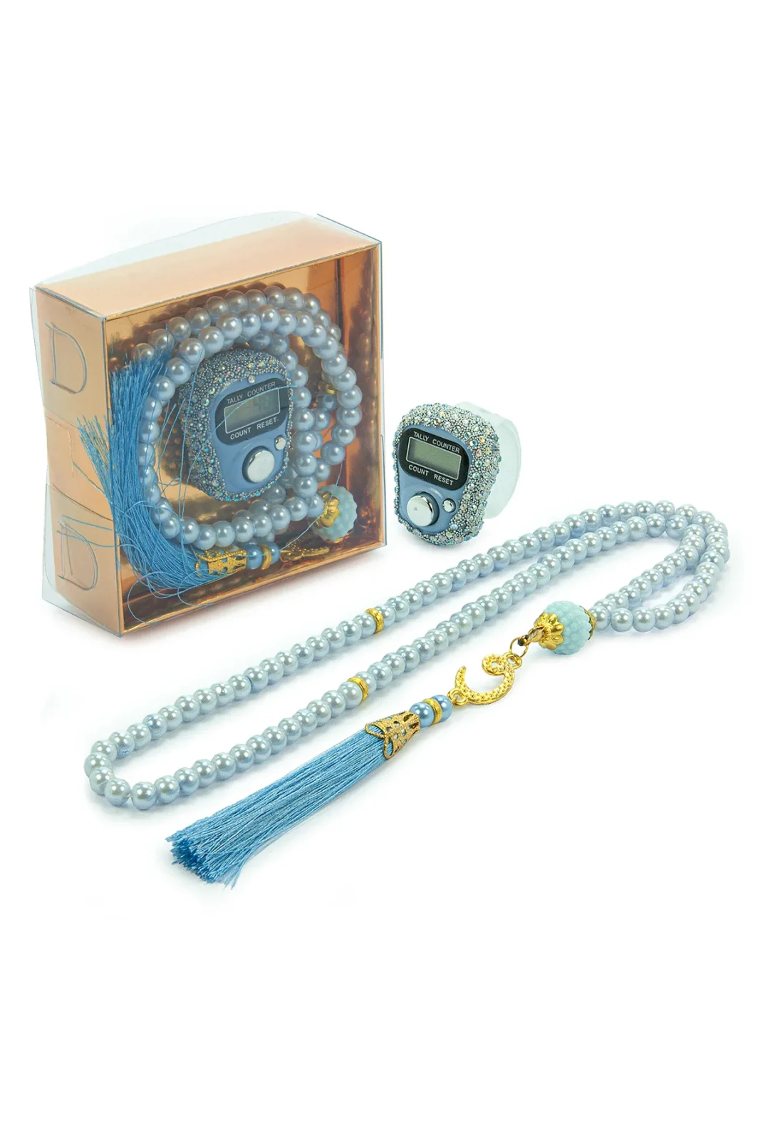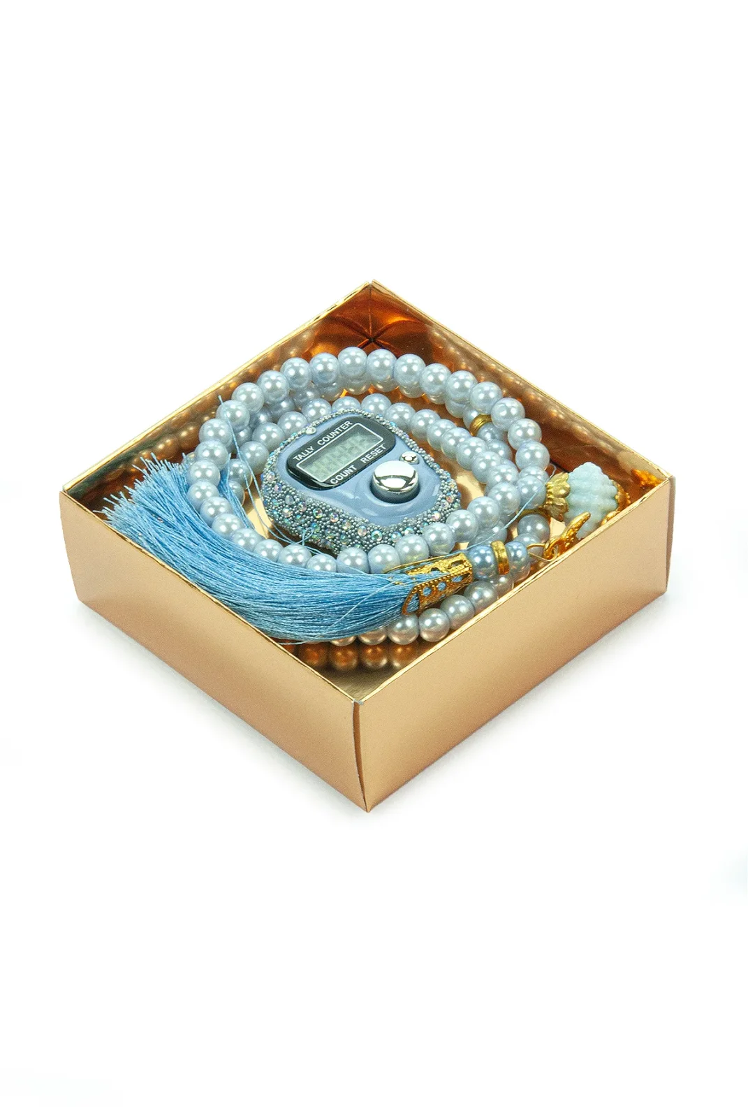 Hediyelik Taşlı Zikirmatik ve 99 lu İnci Tesbih Kutulu Set - Mavi