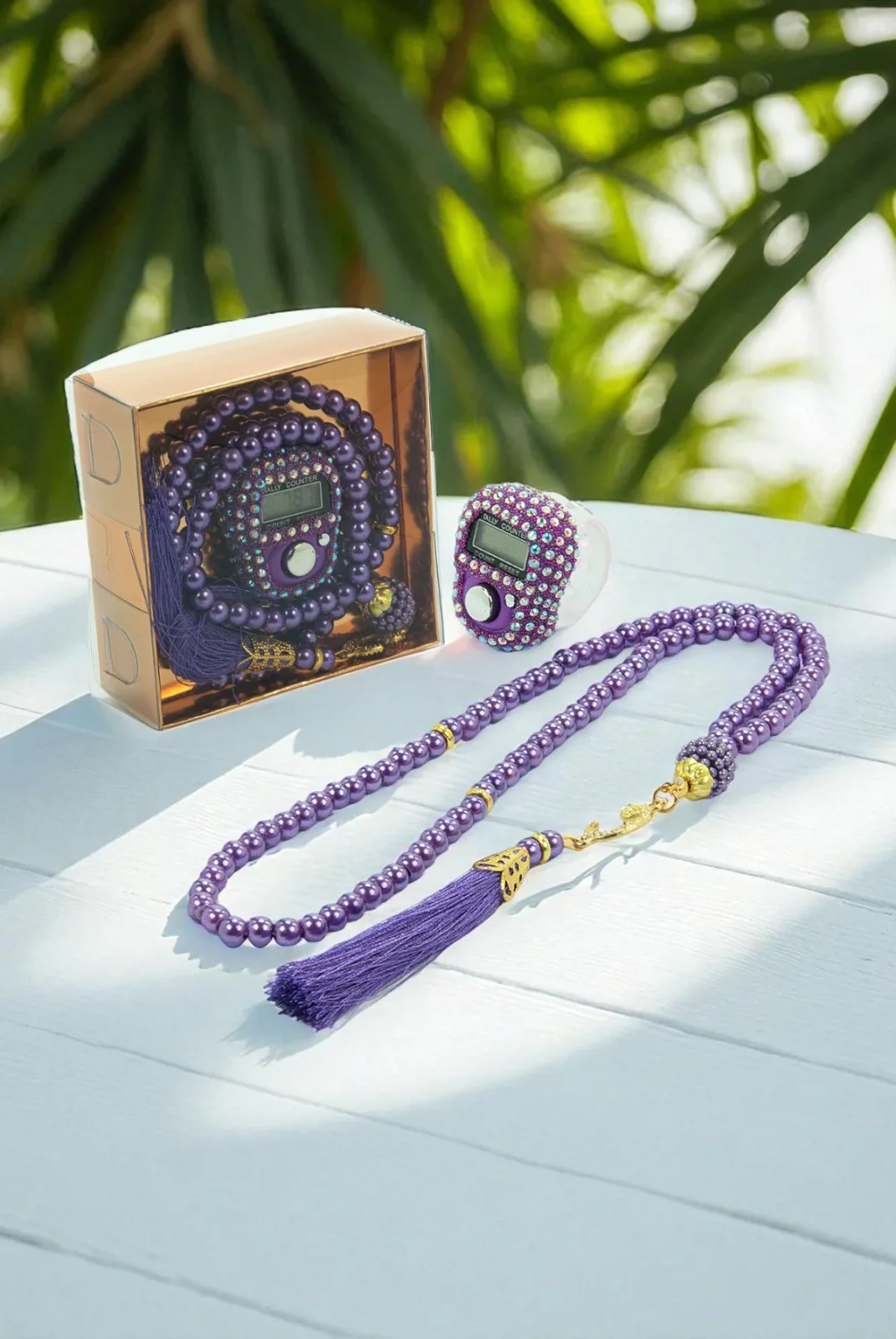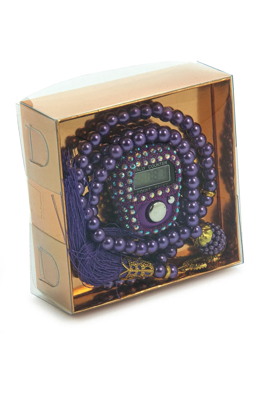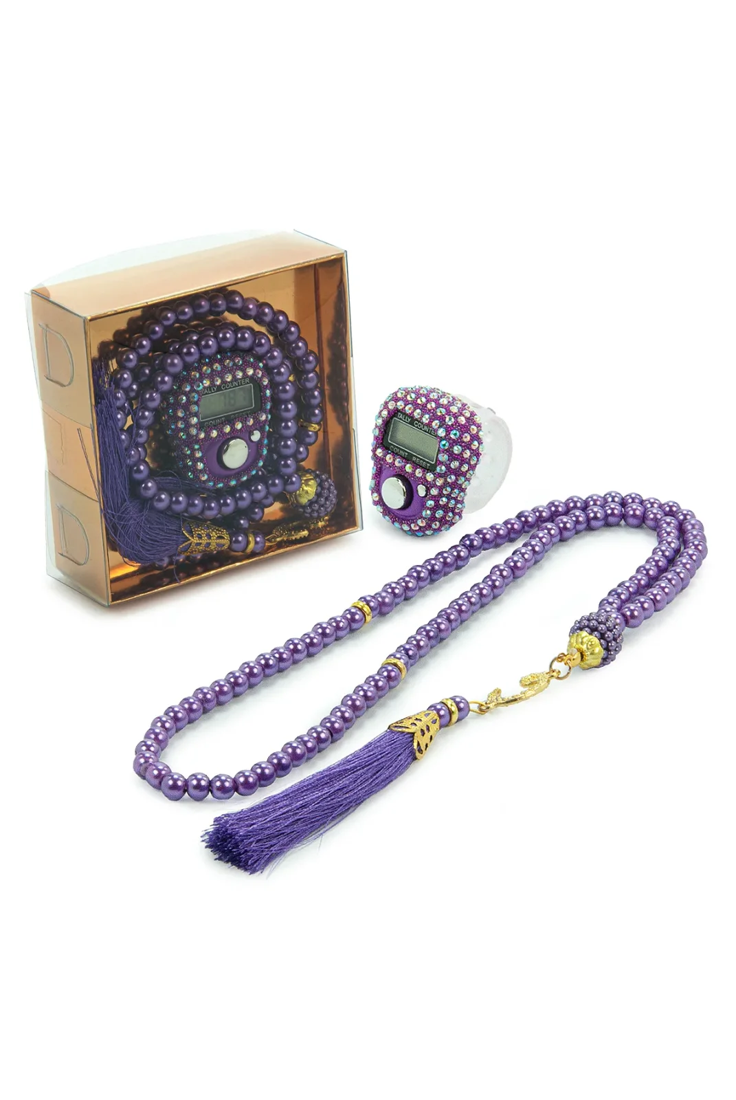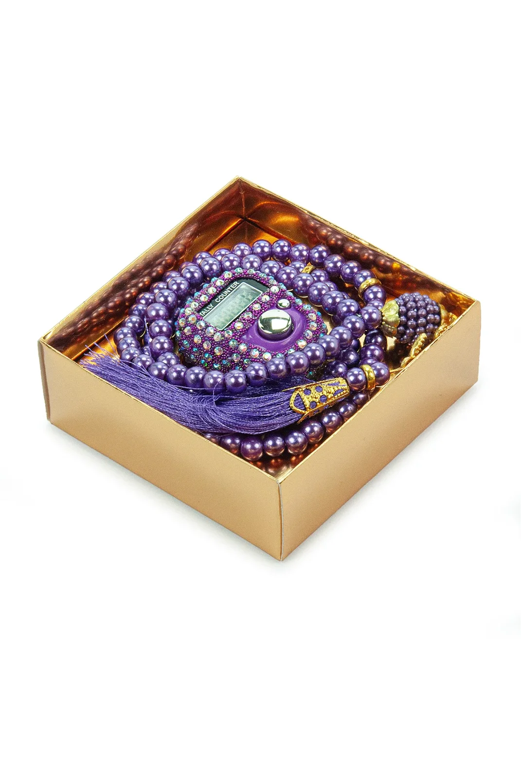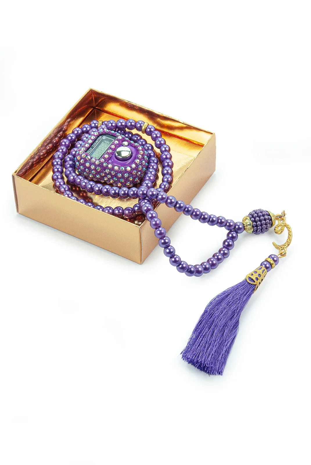 Hediyelik Taşlı Zikirmatik ve 99 lu İnci Tesbih Kutulu Set - Mor