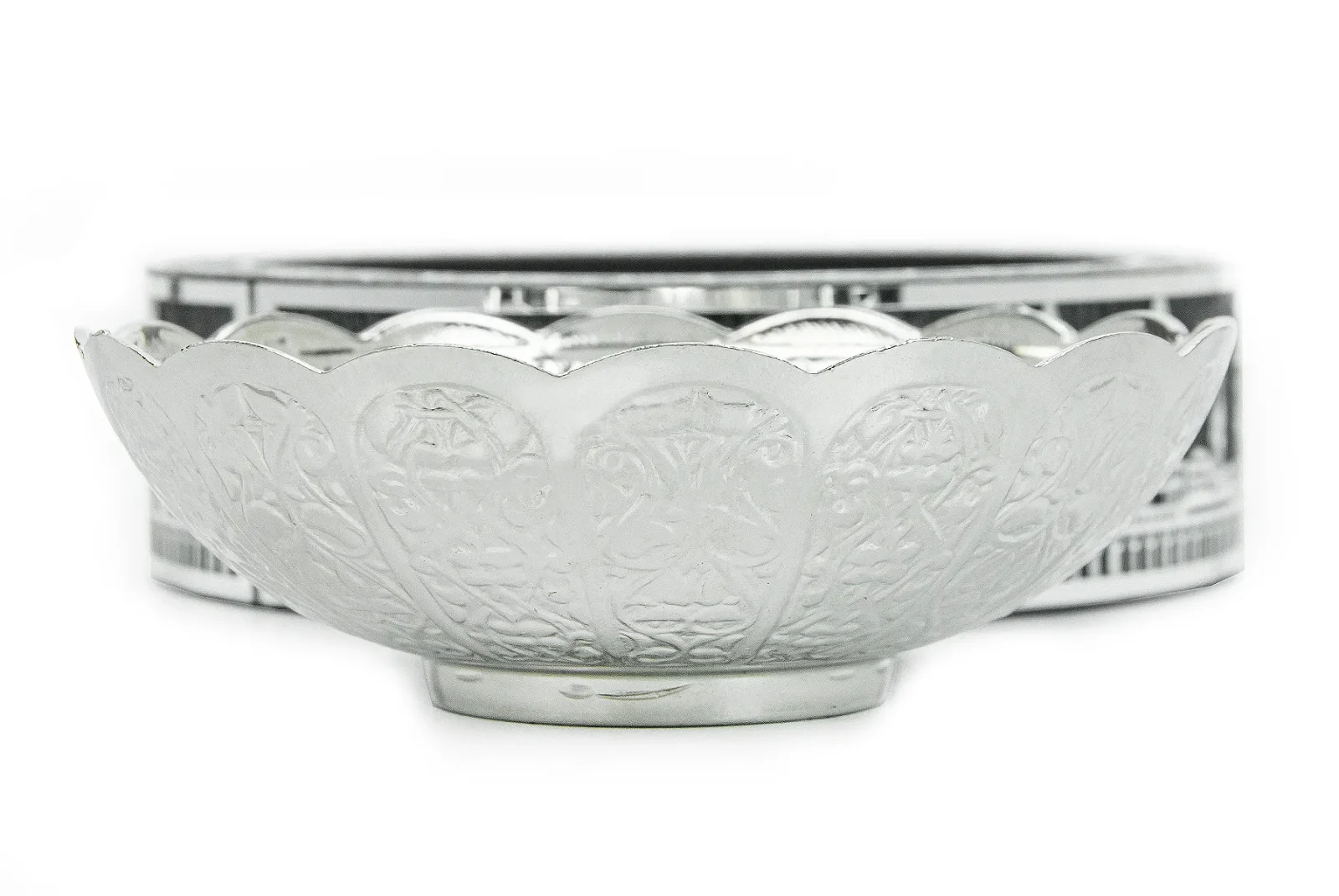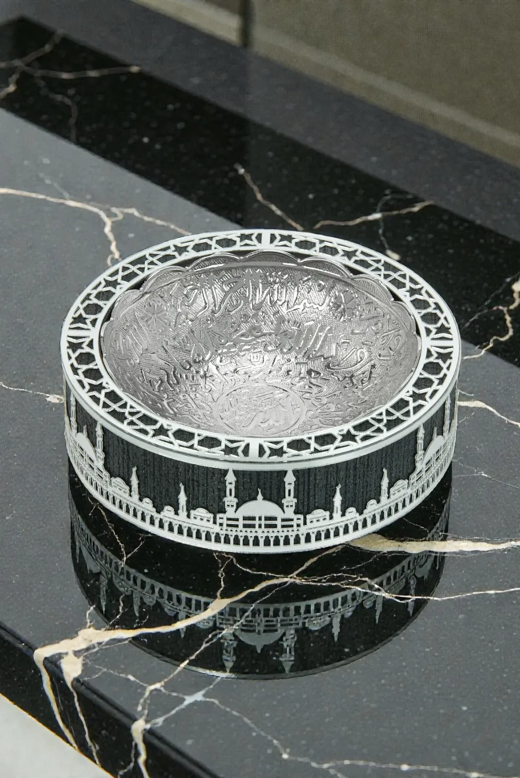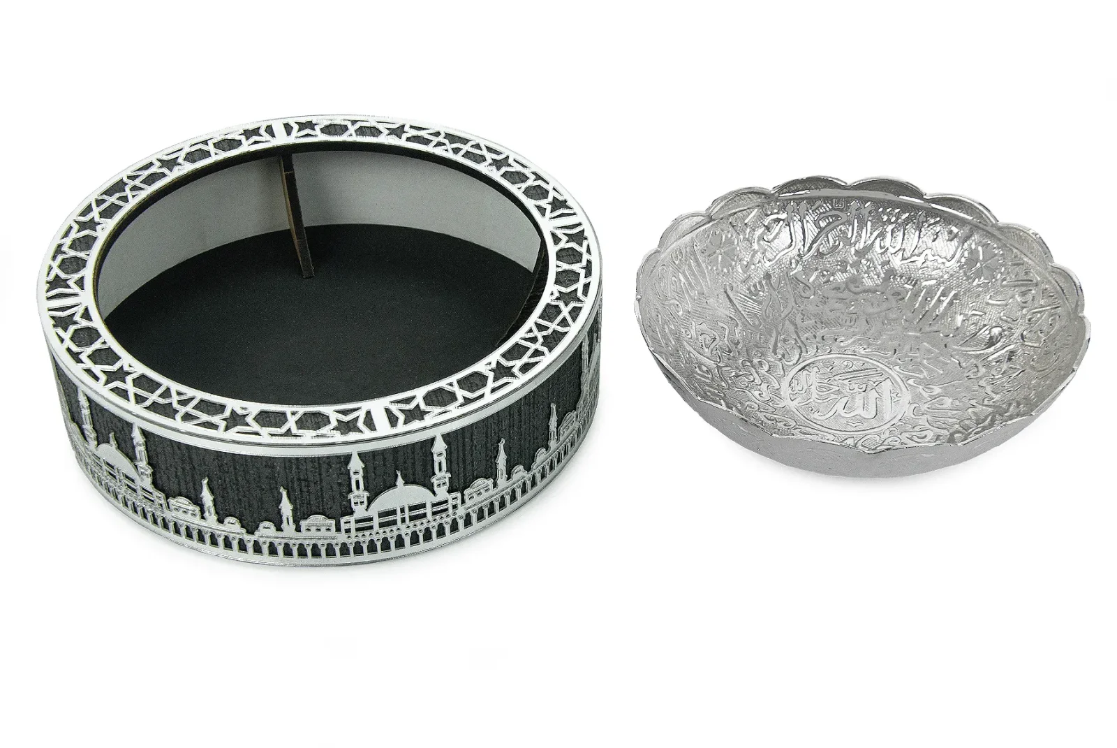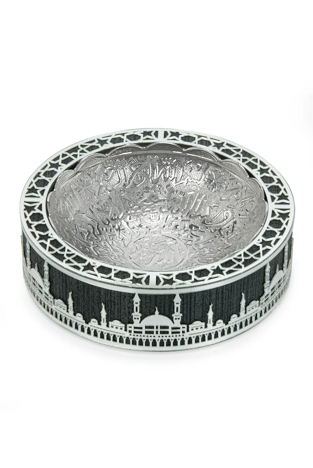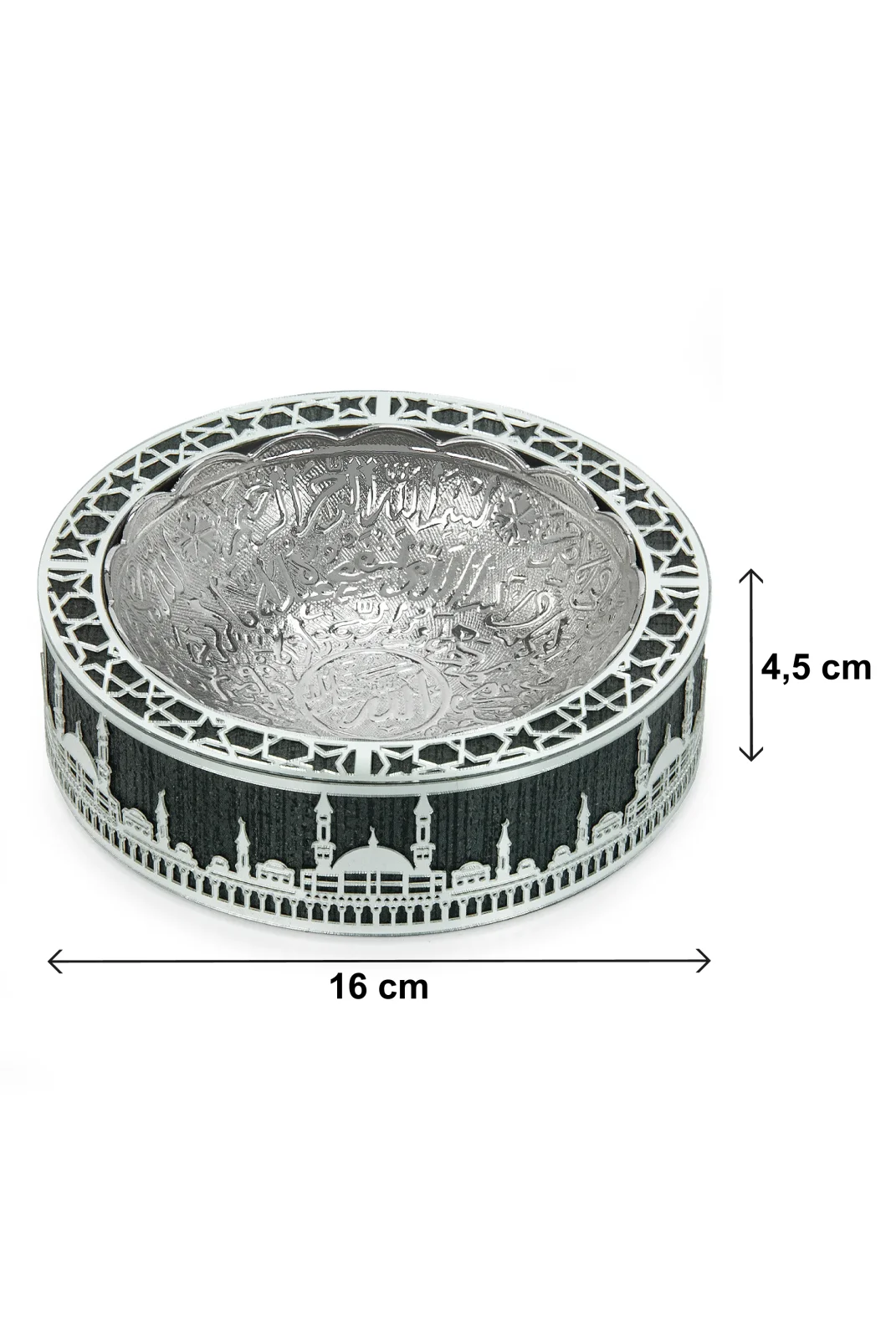 Şıklığı ve zarafetiyle dikkat çeken Hurmalık Tas Gümüş, 16 cm çapında ve 4.5 cm yüksekliğindedir. Tasın iç kısmında kaligrafik yazılar bulunurken, etrafında Mescid-i Haram silueti detaylarıyla zarif bir şekilde tasarlanmıştır. Gümüş işçiliğiyle harmanlanmış olan bu tas, hem dini anlam taşıyan hem de şık bir dekoratif ürün olarak kullanılabilir. Özellikle Ramazan ayında hurma sunumu için tercih edilebileceği gibi, Hac, Umre gibi dini ziyaretlerde de hediye olarak ideal bir seçimdir.