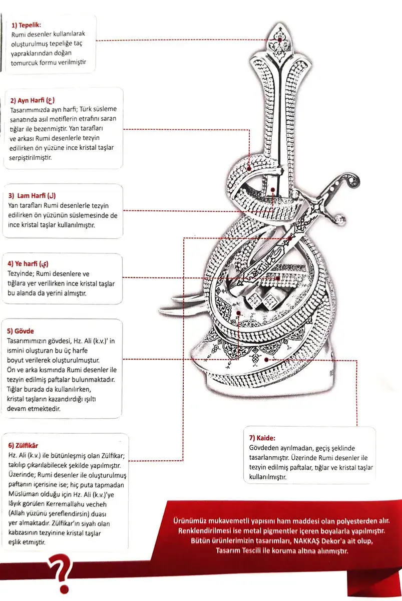 6) Zulfikar Hazrat Mahdi (As) Ali (k.v. Zulfikar, which is integrated with), is made in such a way that it can be inserted and removed. On it; inside the sheet formed with Rumi patterns; Hazrat Mahdi (as) is a Muslim without worshipping idols. Ali (k.v.) is the prayer of Kerremallahu vecheh (may Allah honor his face).