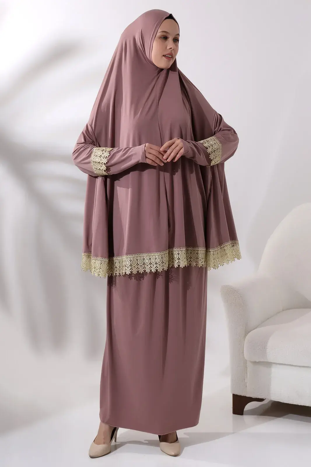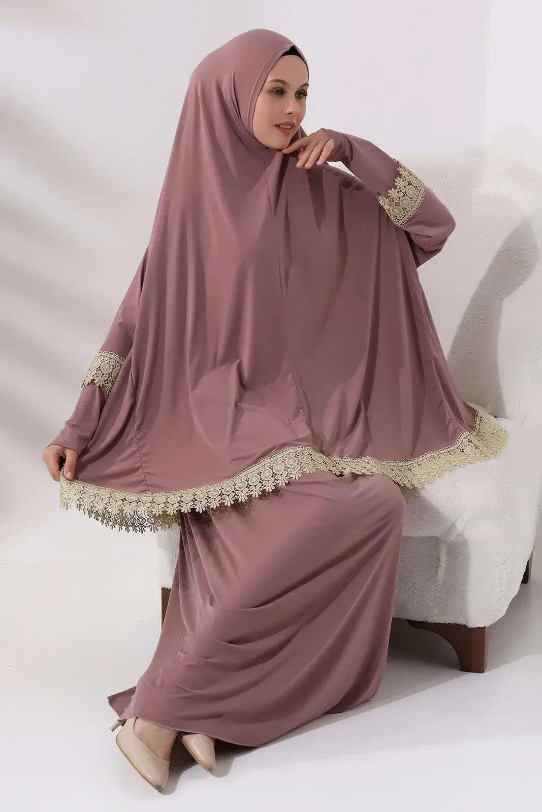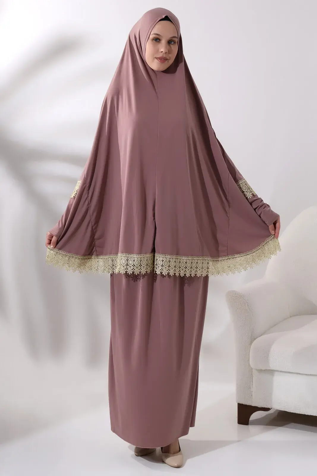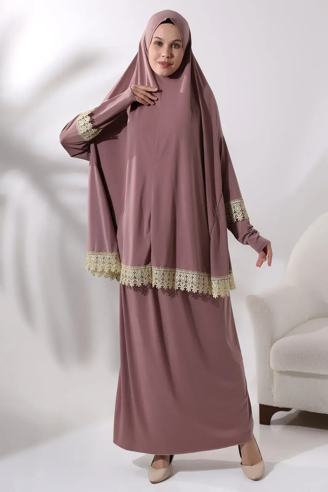 İki Parça Fistolu Pratik Alt Üst Namaz Elbisesi 8018 Gül Kurusu