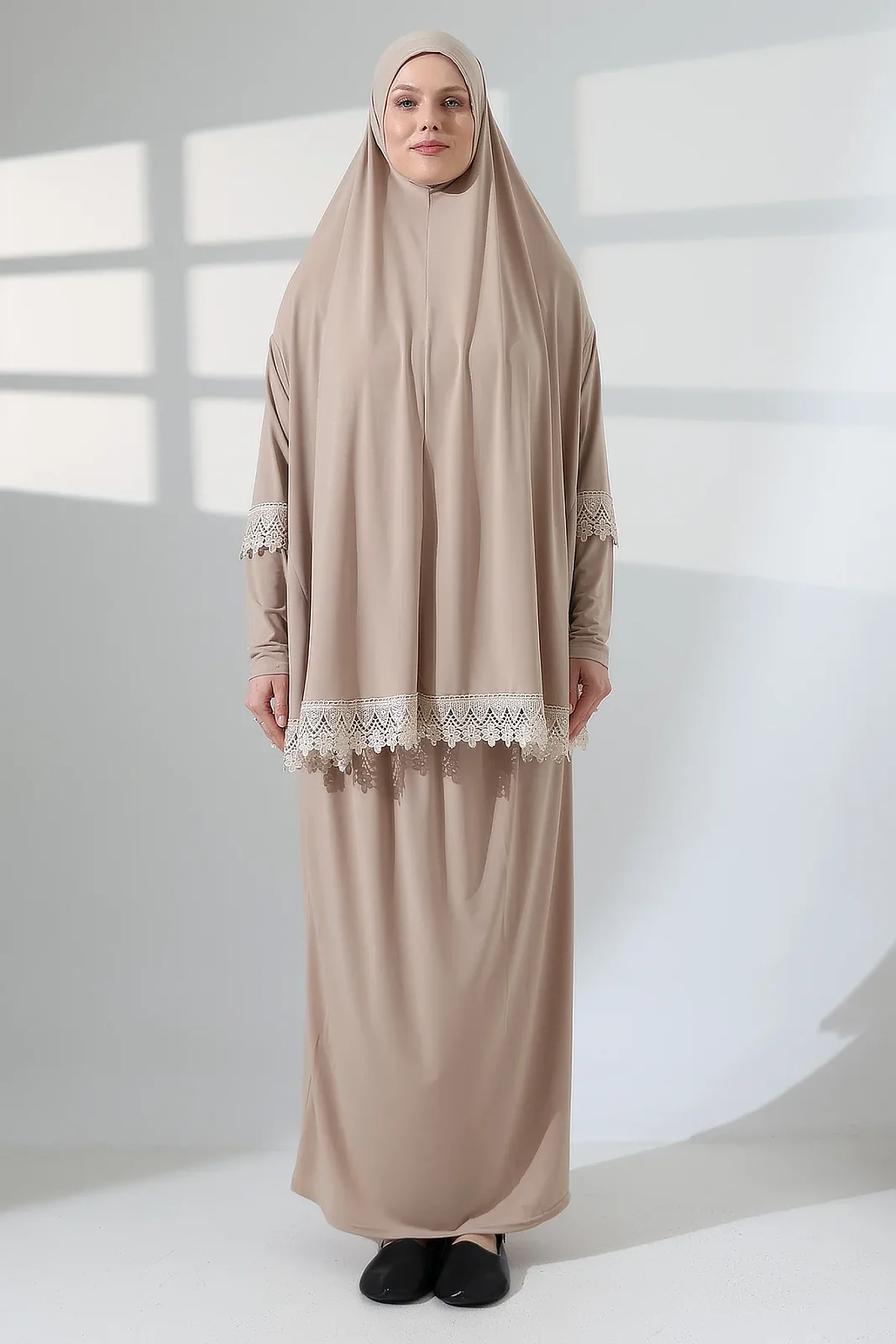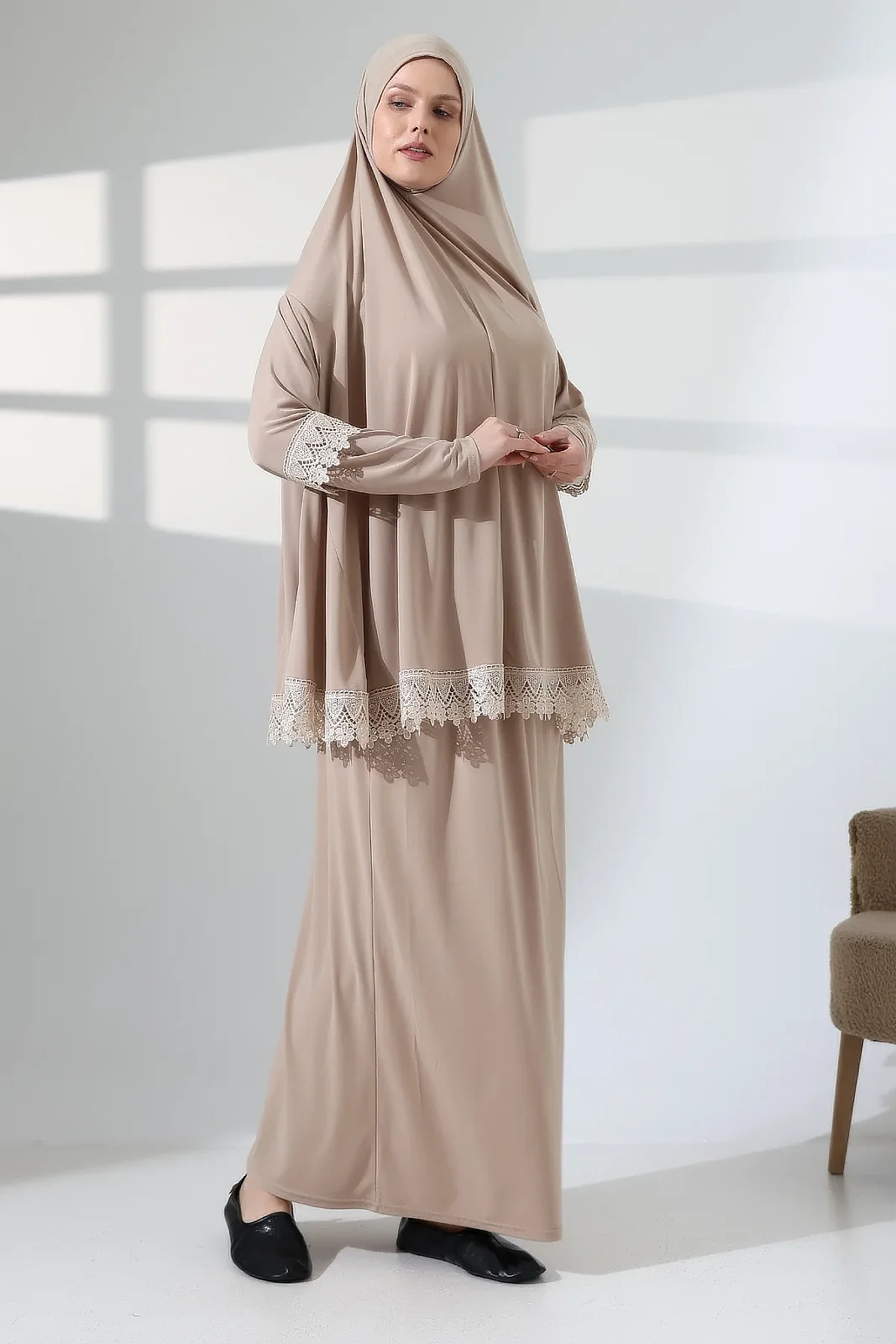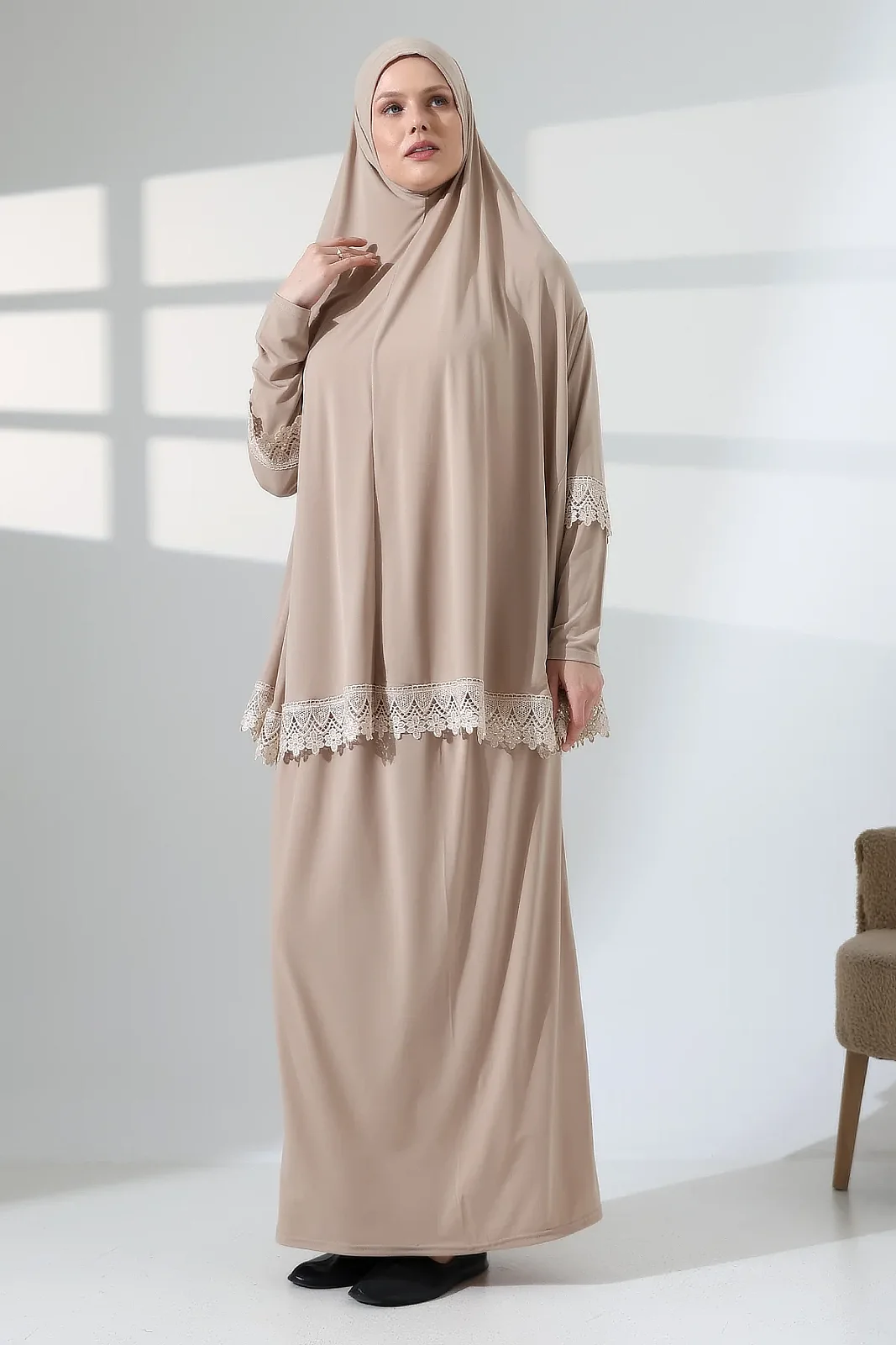 İki Parça Fistolu Pratik Alt Üst Namaz Elbisesi 8018 Vizon