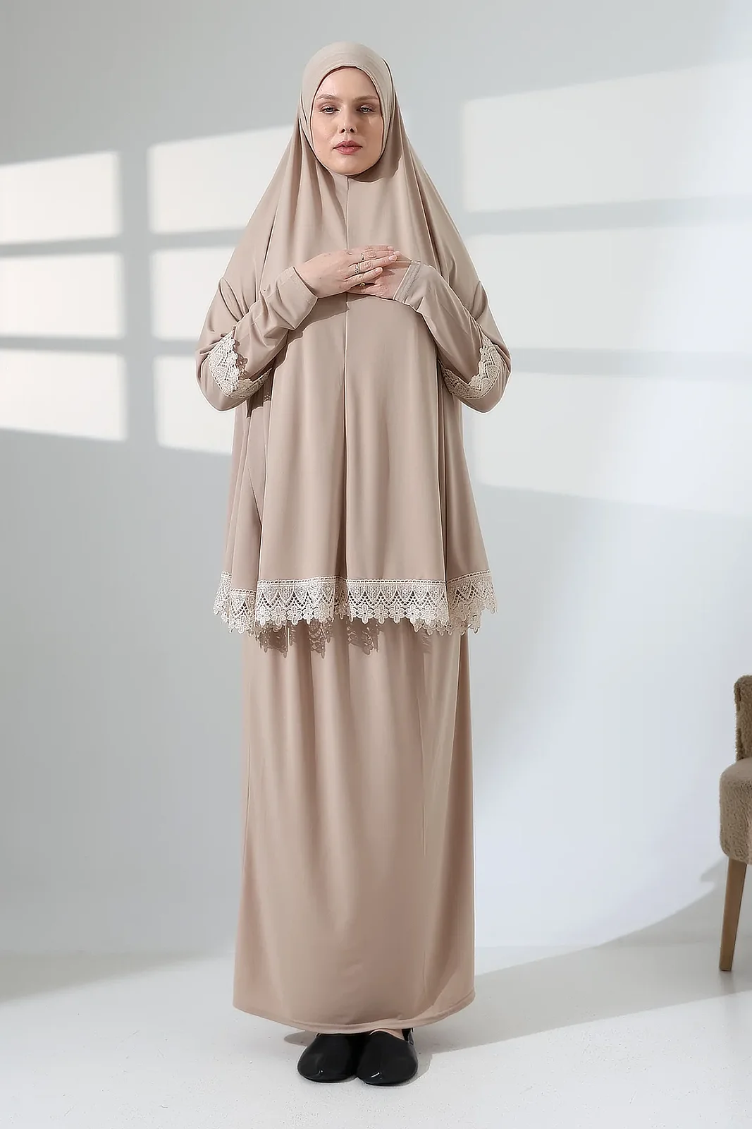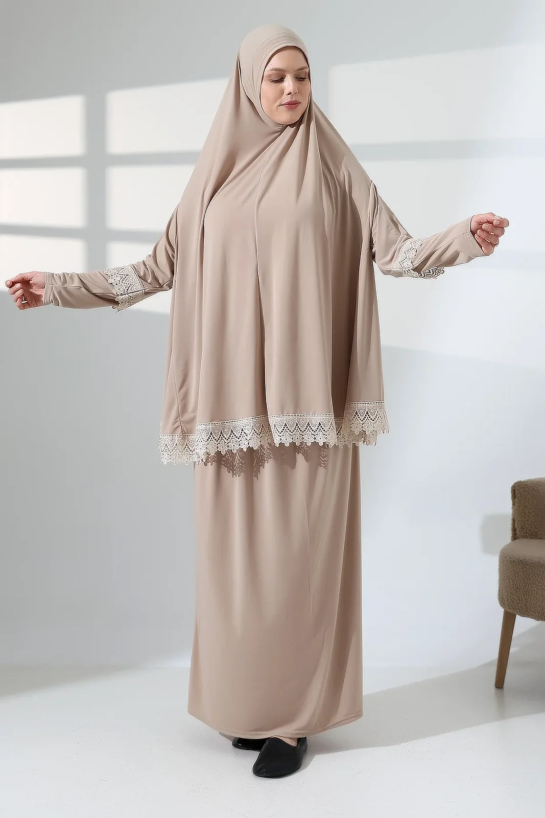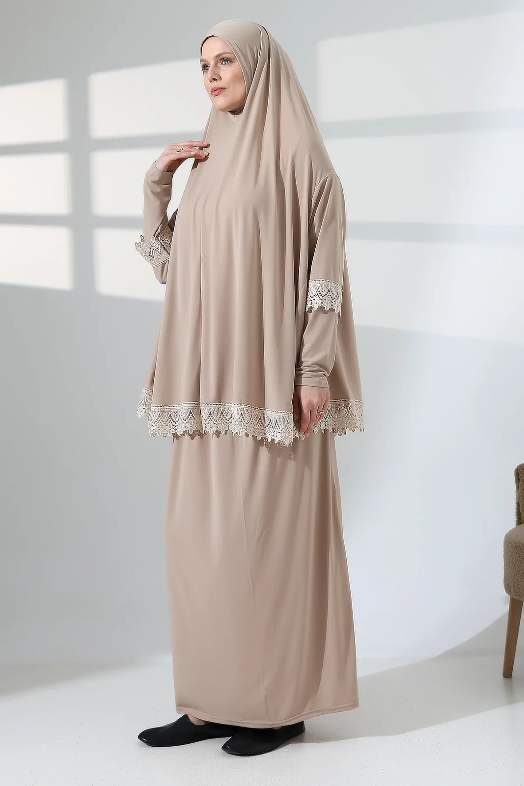 İki Parça Fistolu Pratik Alt Üst Namaz Elbisesi 8018 Vizon