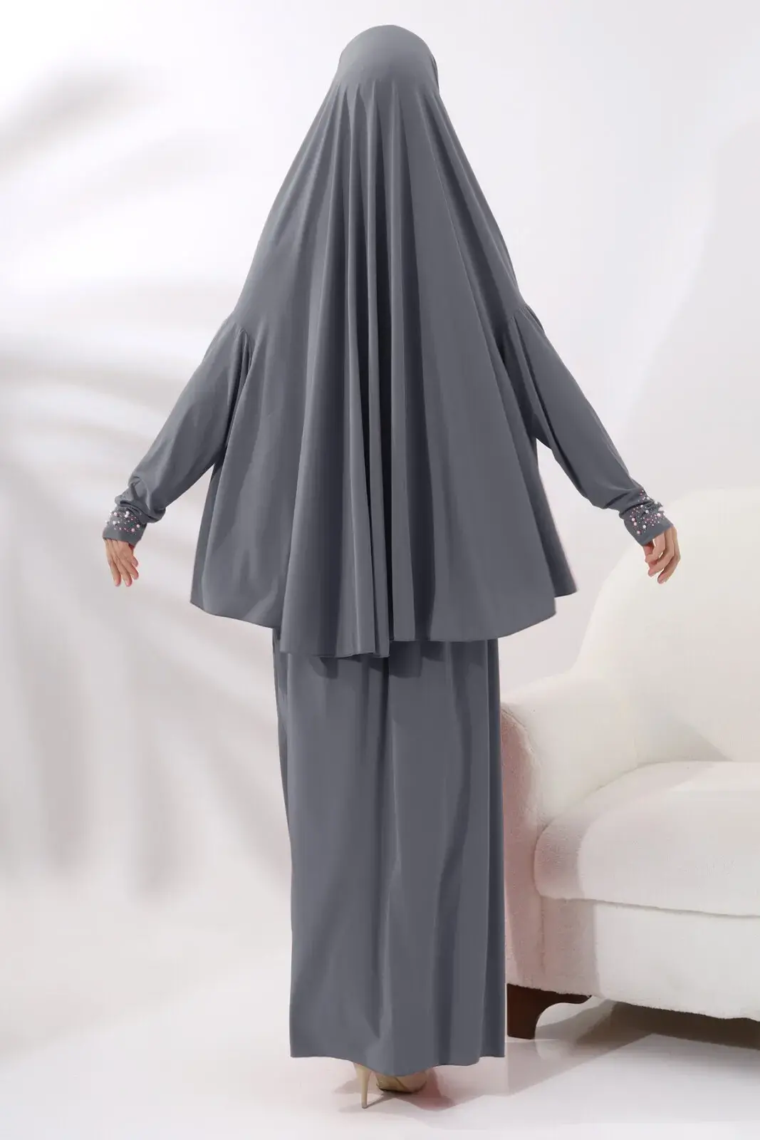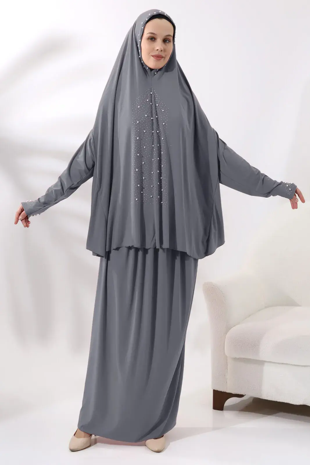 İki Parça İnci Taşlı Alt Üst Pratik Namaz Elbisesi 8017 Gri