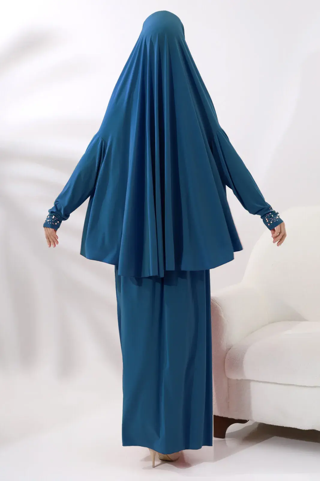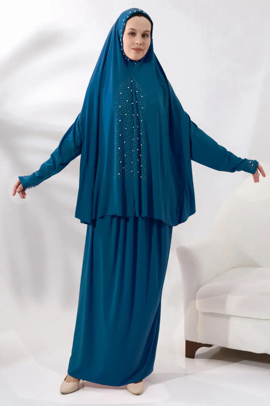 İki Parça İnci Taşlı Alt Üst Pratik Namaz Elbisesi 8017 Petrol