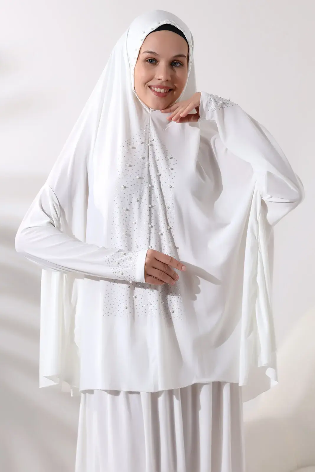 İki Parça İncili Taşlı Alt Üst Pratik Namaz Elbisesi 8017 Beyaz