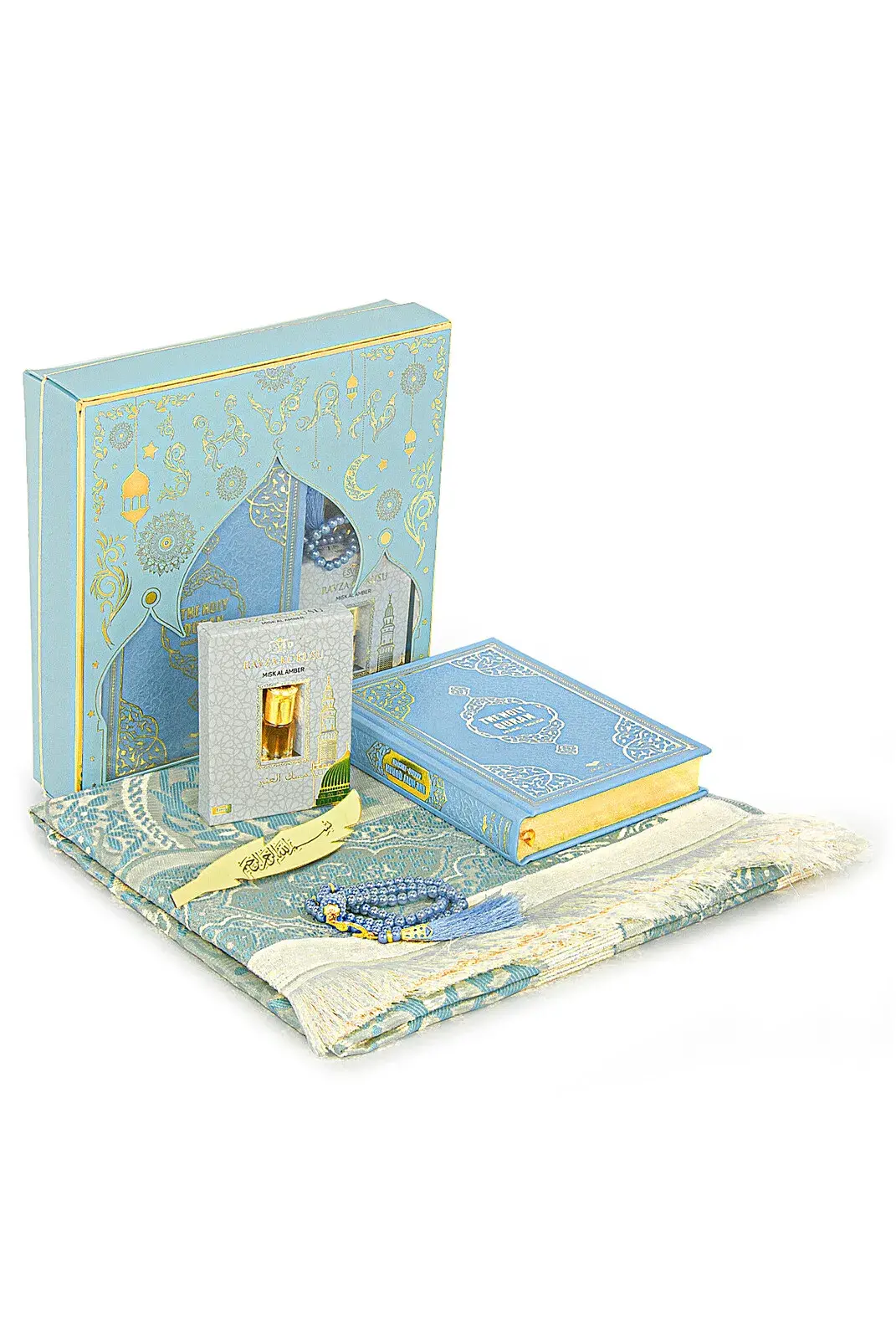 İngilizce Mealli Medine Hatlı Kuranı Kerim ve Seccade Seti Mavi