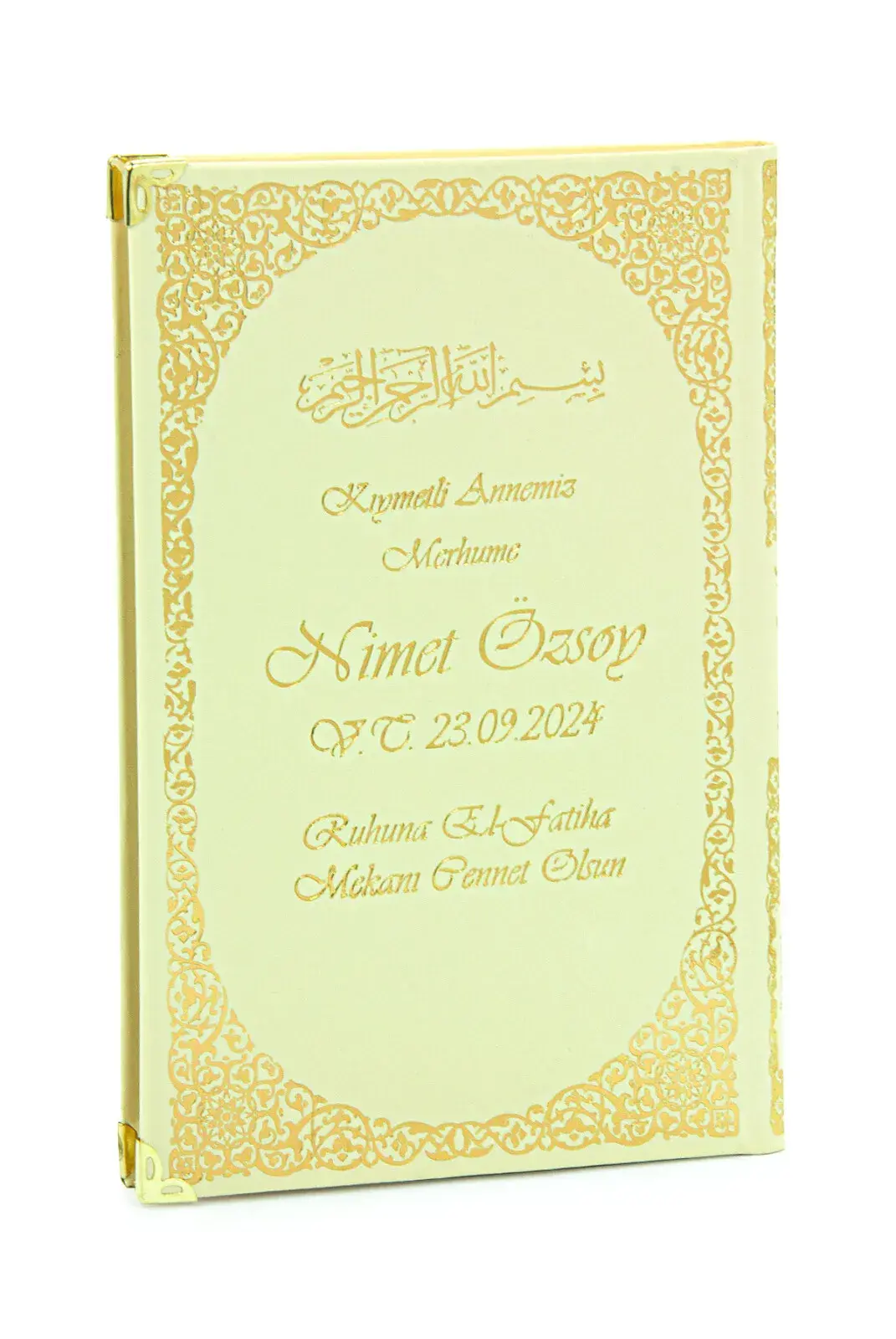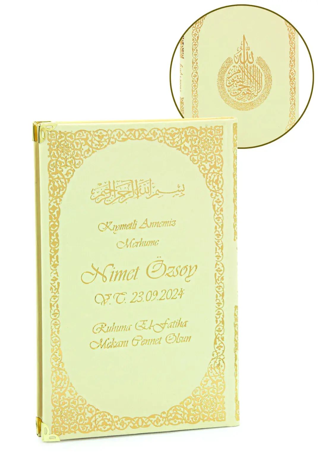İsim Baskılı Ayet-el Kürsi Desenli Yaldızlı Deri Ciltli Orta Boy Yasin Kitabı Mevlüt Hediyesi 128 Sayfa Krem