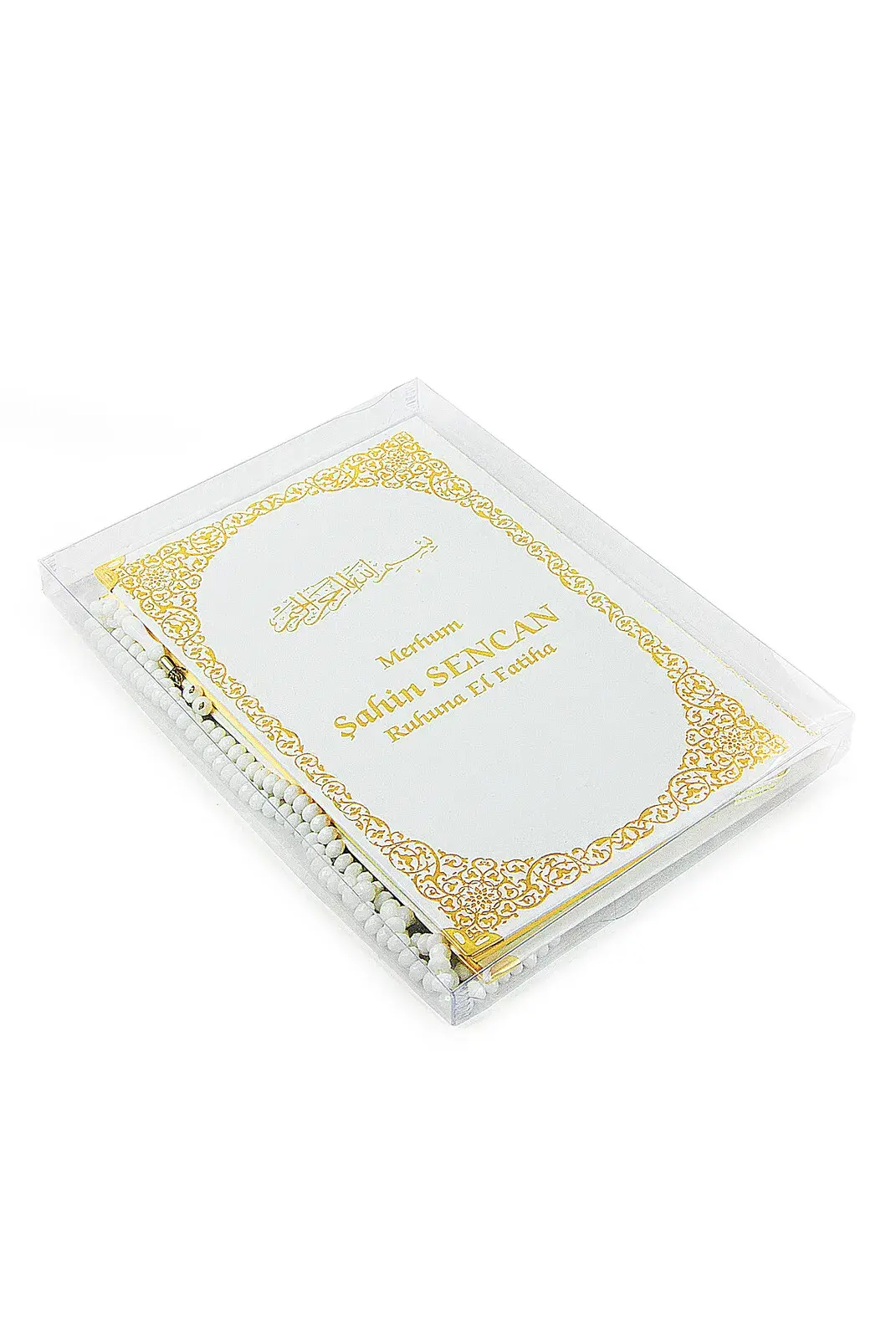 İsim Baskılı Yaldızlı Deri Ciltli Yasin Kitabı - Orta Boy - Şeffaf Kutulu - Tesbihli - Beyaz Renk