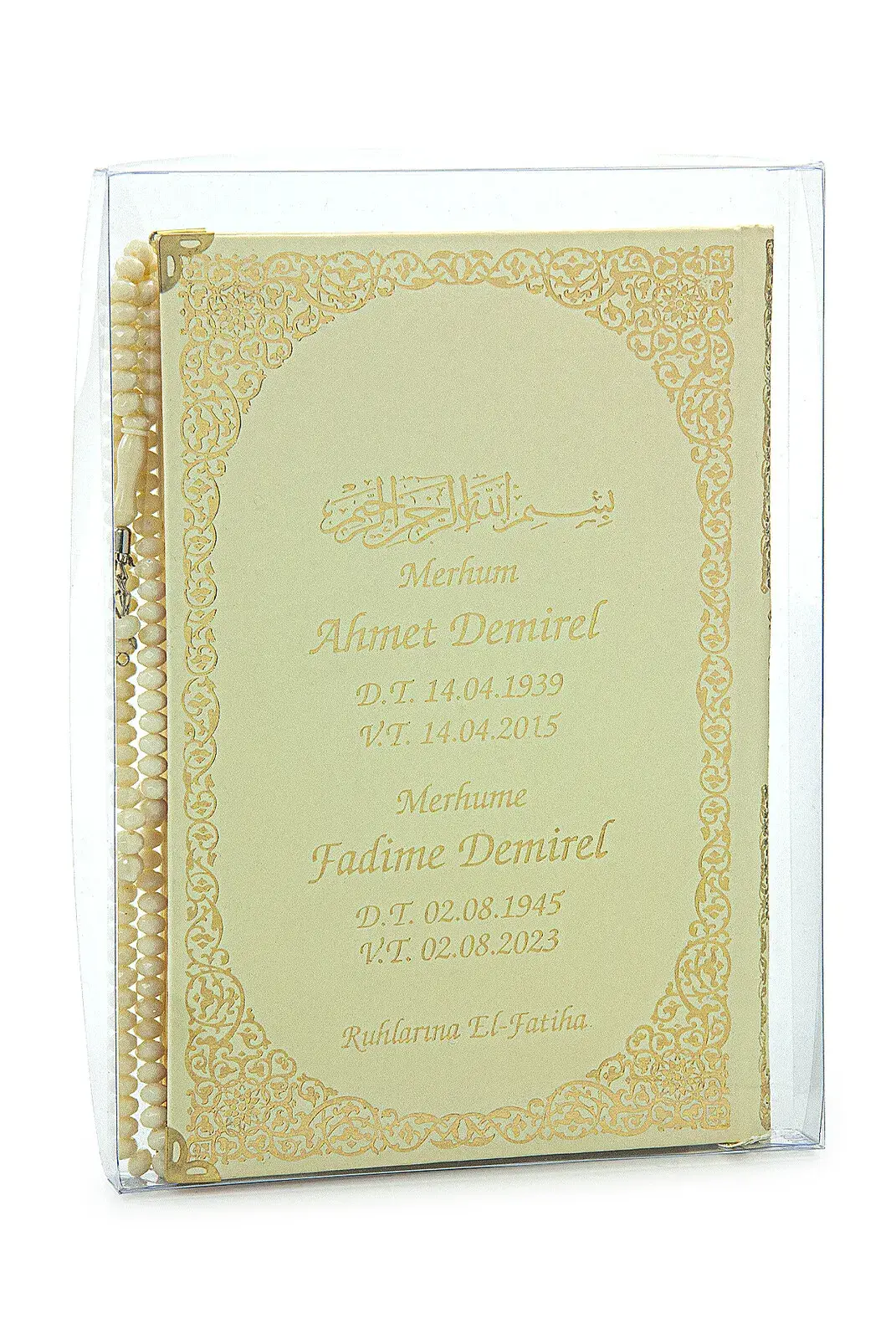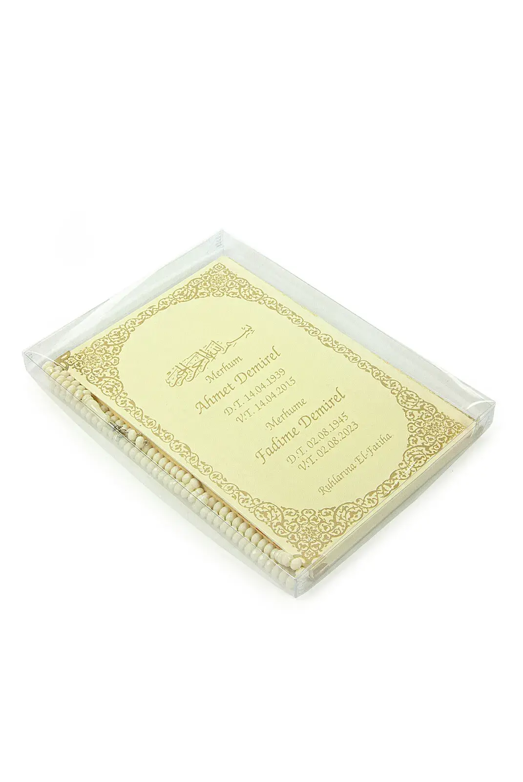 İsim Baskılı Yaldızlı Deri Ciltli Yasin Kitabı - Orta Boy - Şeffaf Kutulu - Tesbihli - Krem Renk