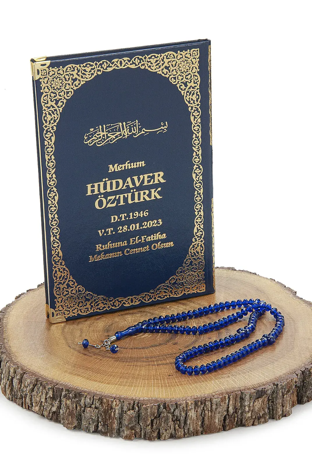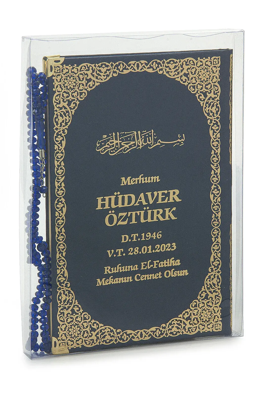 İsim Baskılı Yaldızlı Deri Ciltli Yasin Kitabı - Orta Boy - Şeffaf Kutulu - Tesbihli - Lacivert Renk