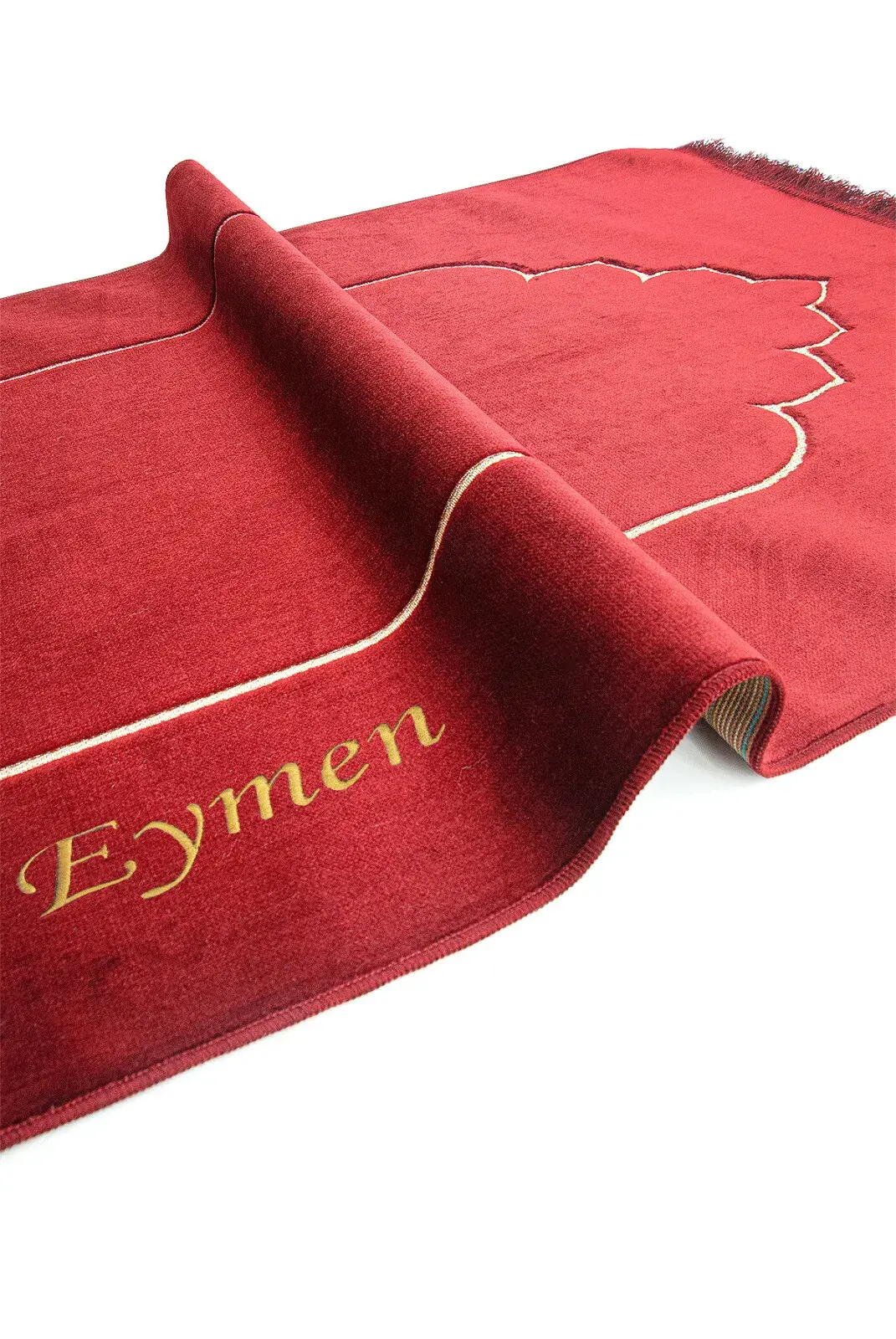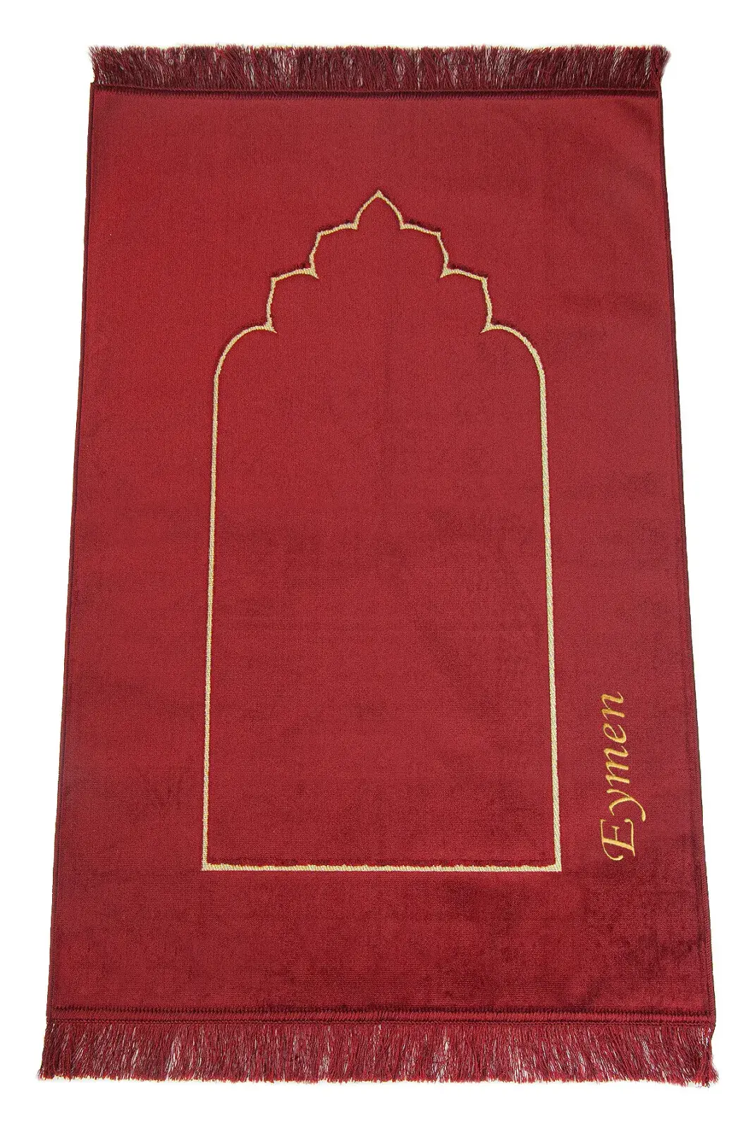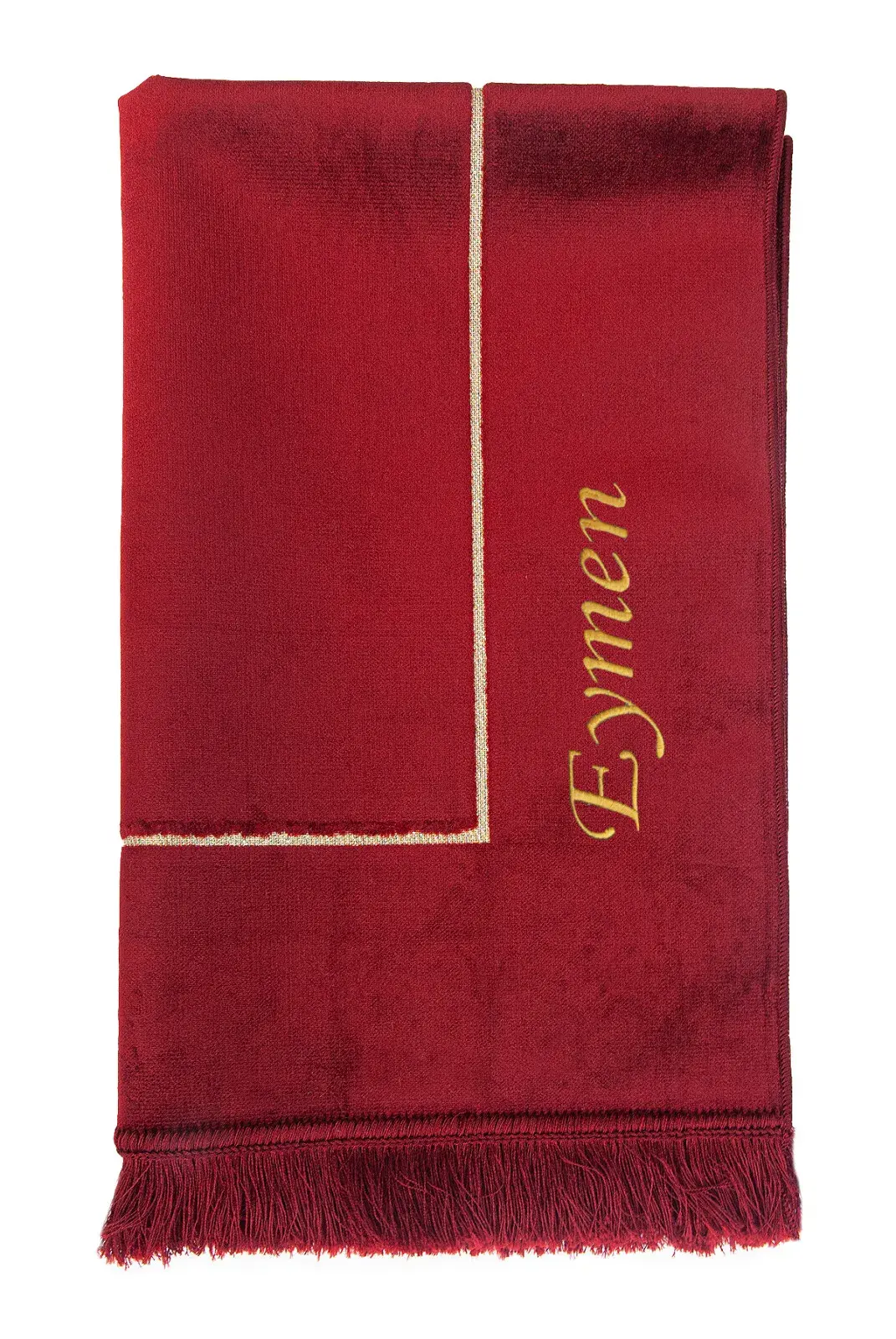 İsim Nakışlı Mihrap Desenli Kadife Seccade Bordo