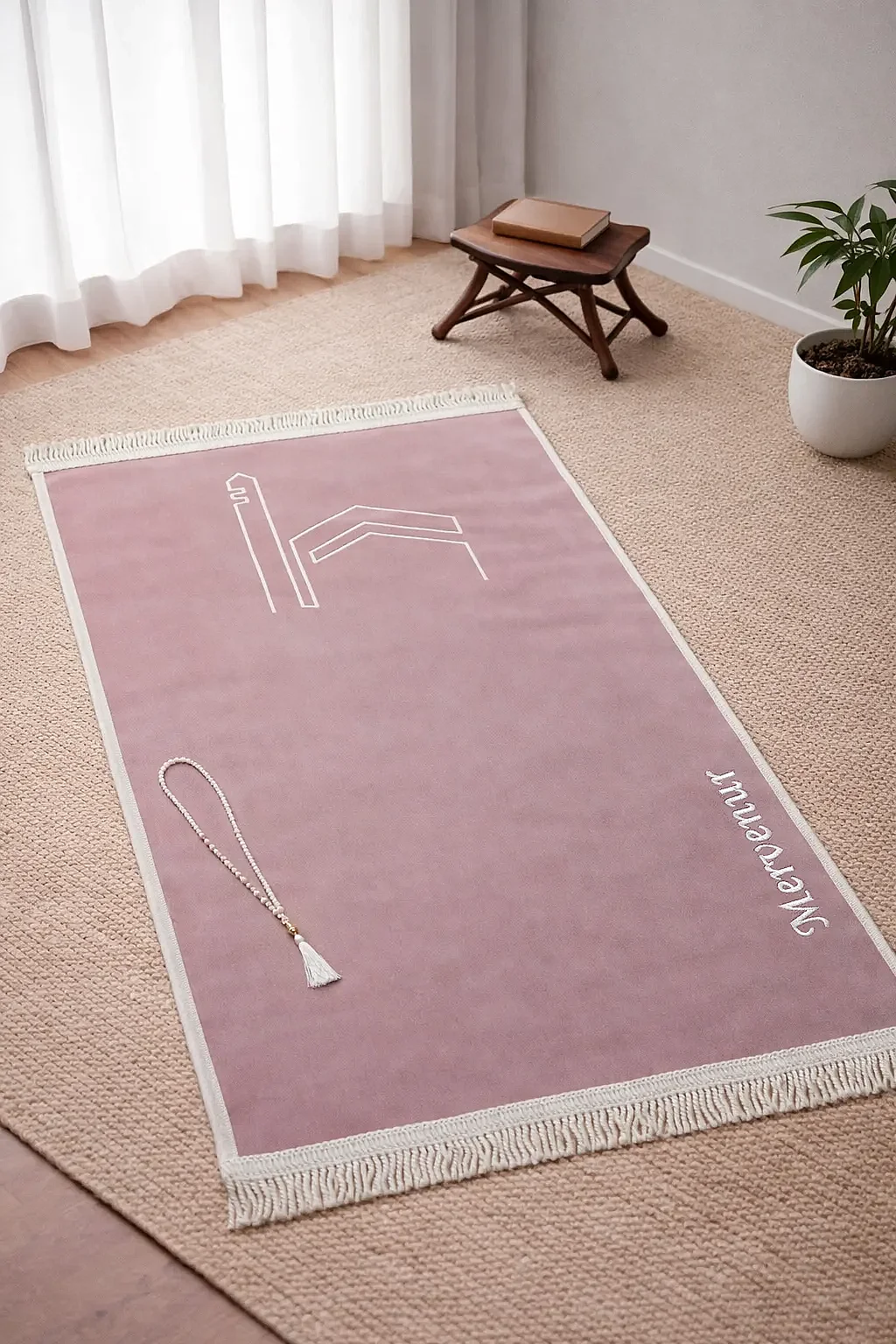 İsme Özel Kabe İşlemeli Lüks Kadife Seccade - Çeyizlik, Hac ve Umre Hediyelik Namazlık - Pembe