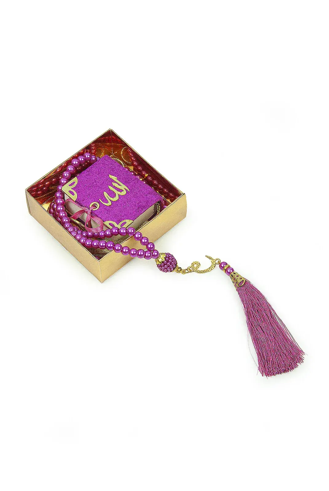İsme Özel Kutulu İnci Tesbihli Kadife Kaplı Mini Kuran Mevlüt Hediyesi Fuşya