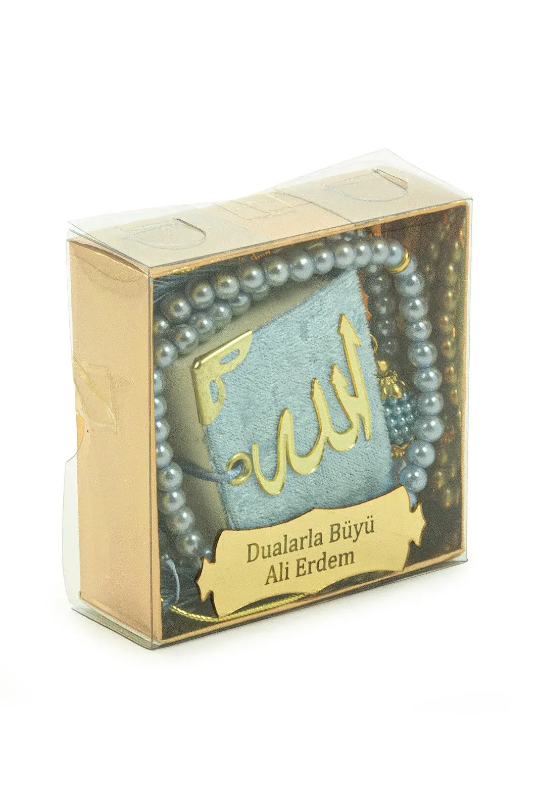 İsme Özel Kutulu İnci Tesbihli Kadife Kaplı Mini Kuran Mevlüt Hediyesi Mavi