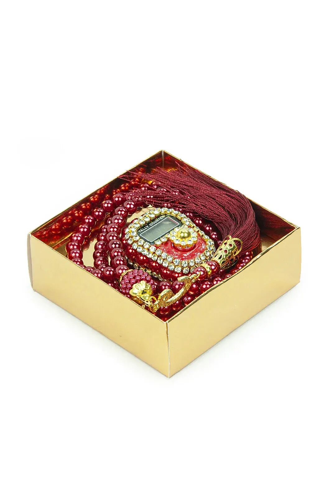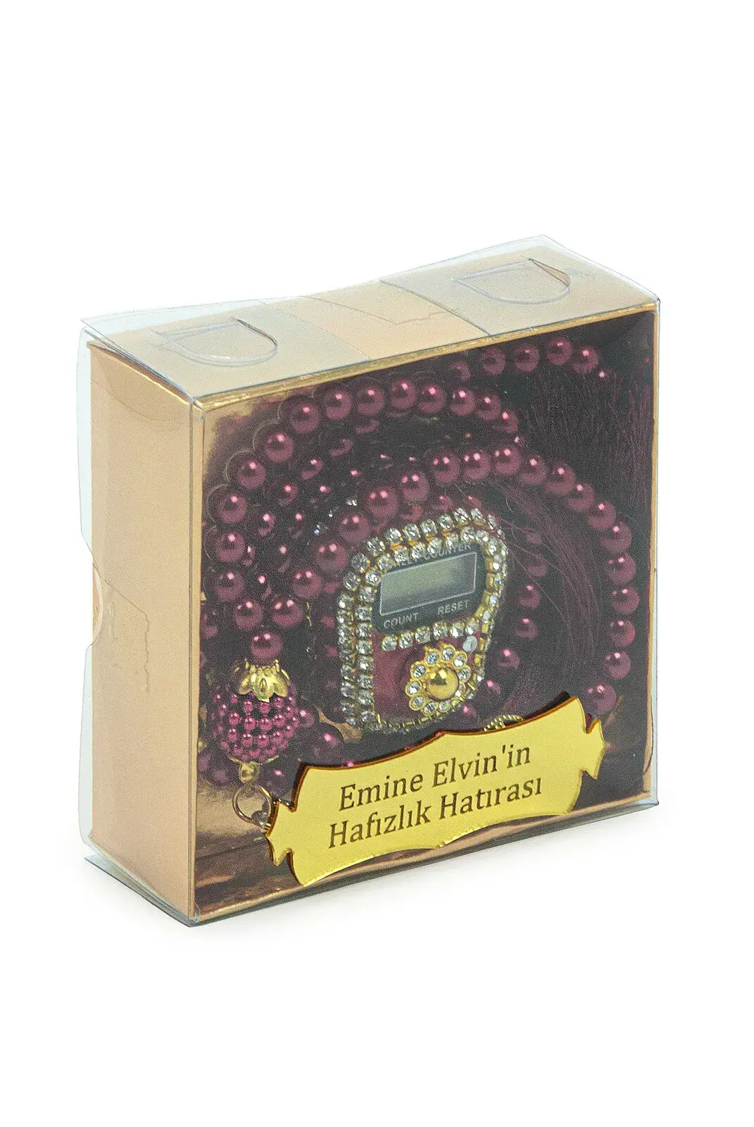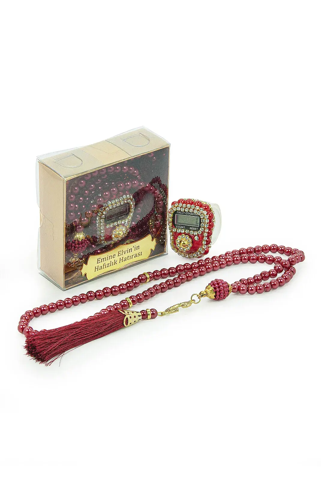 İsme Özel Kutulu İnci Tesbihli Taşlı Zikirmatik Mevlüt Hediyesi Kırmızı